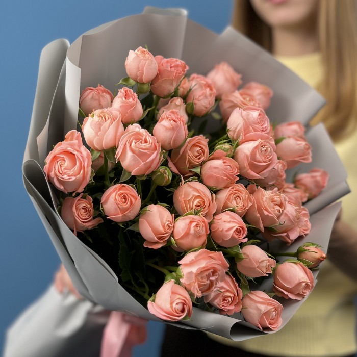 Очаровательный букет из 15 кустовых роз сорта Амэйзинг Мэджик 50 см — это настоящий микс красоты и нежности.