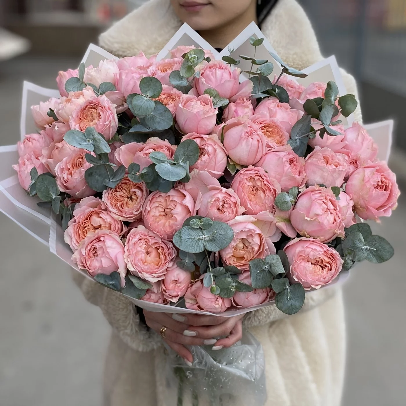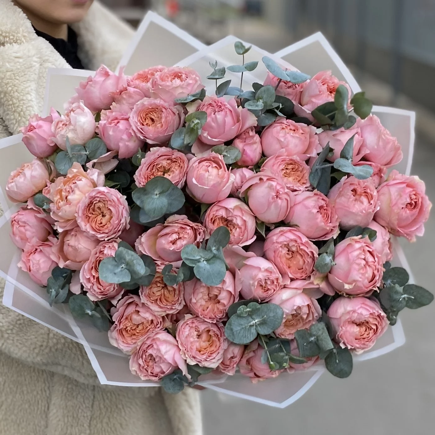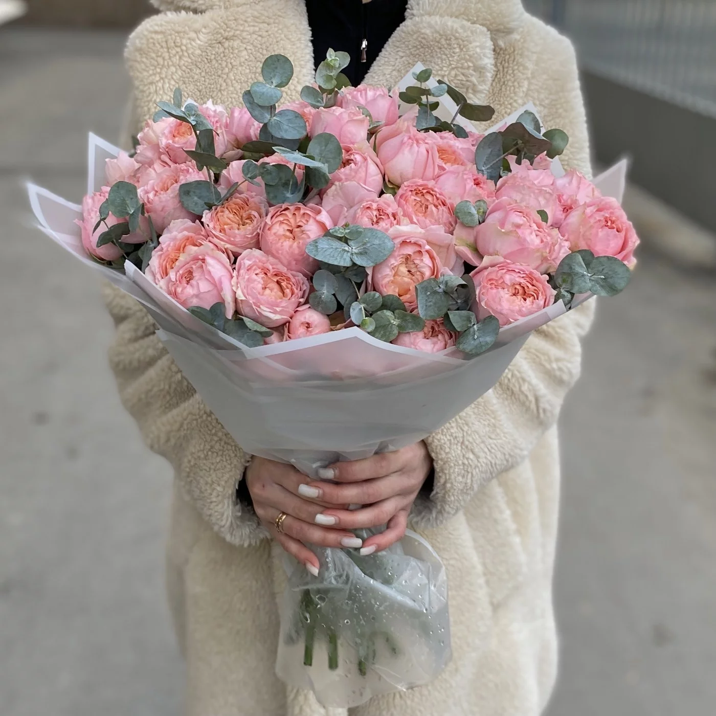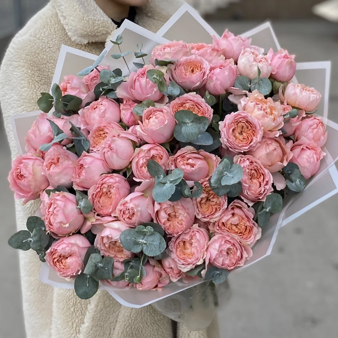 15 кустовых пионовидных роз Джульетта с эвкалиптом