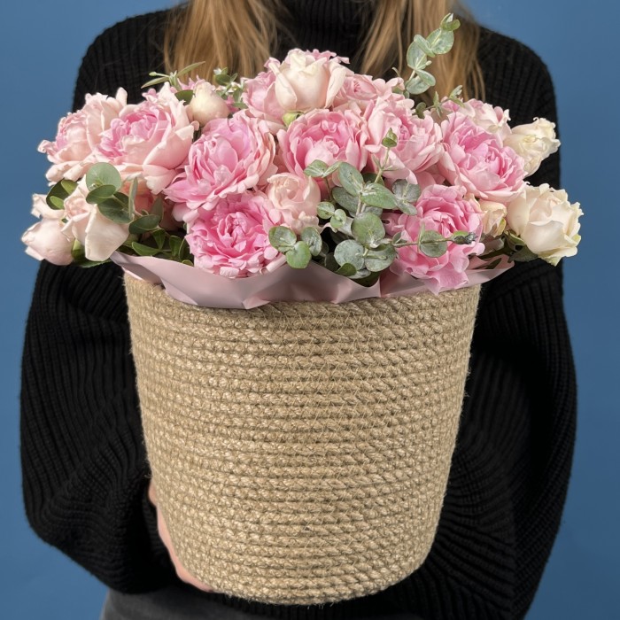Впечатляющее кашпо с 15 пышными кустовыми розами сорта Кэнди Флоу. Эти красивые пионовидные розы с насыщенными оттенками и нежными лепестками создают изысканную и уютную атмосферу. Такая композиция идеально подойдет для праздничного украшения интерьера или в качестве стильного подарка, подчеркивающего ваш вкус и любовь к красоте.