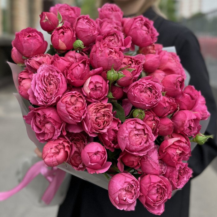 Букет из 15 кустовых пионовидных роз сорта Вишневая Джульетта — это по-настоящему роскошная цветочная композиция, которая впечатляет своим объёмом, насыщенным цветом и изысканным ароматом. Такой букет — это не просто подарок, а яркое признание в чувствах, символ внимания, любви и утончённого вкуса.