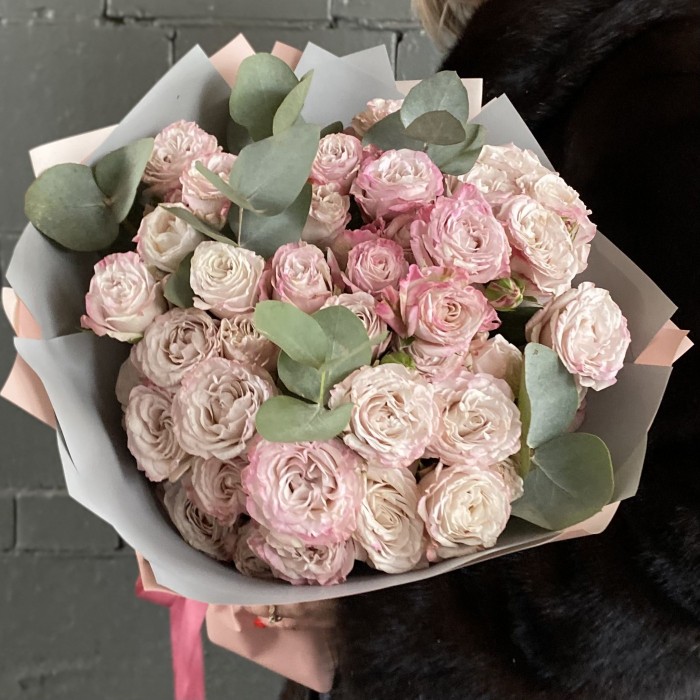 15 кустовых розовых роз Ангел Бомбастик с эвкалиптом