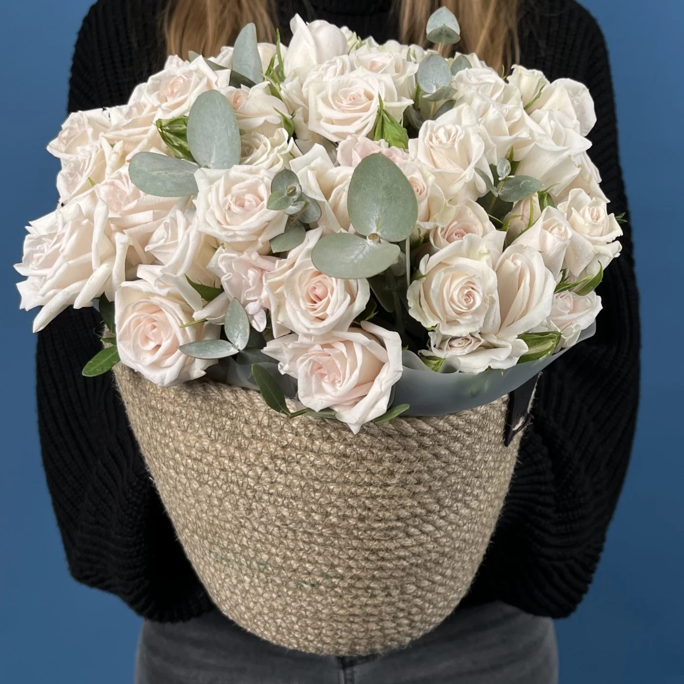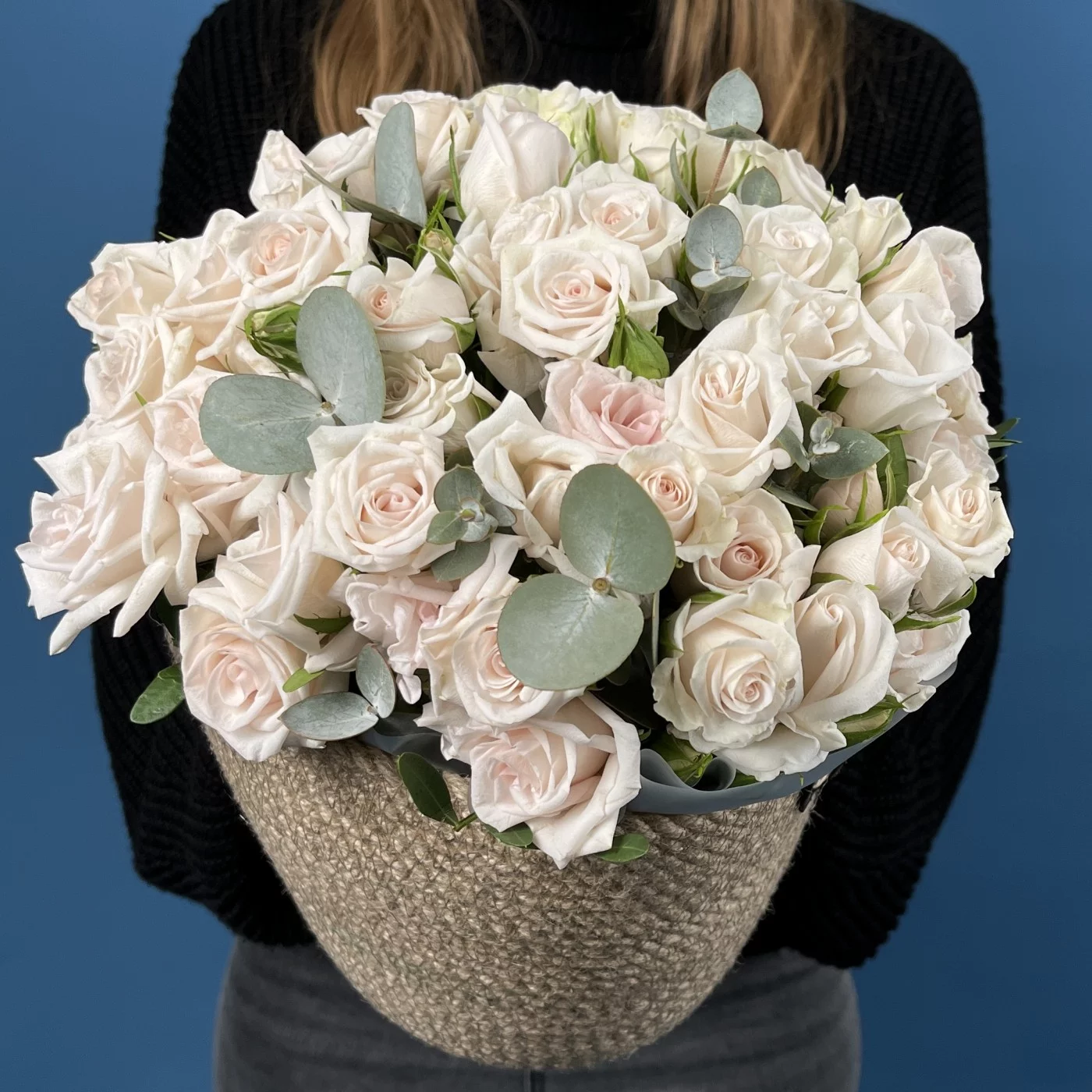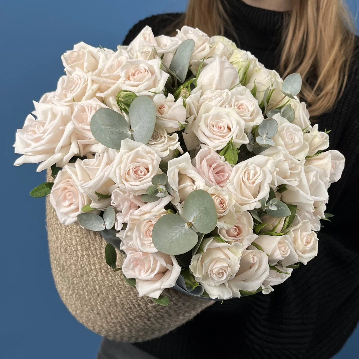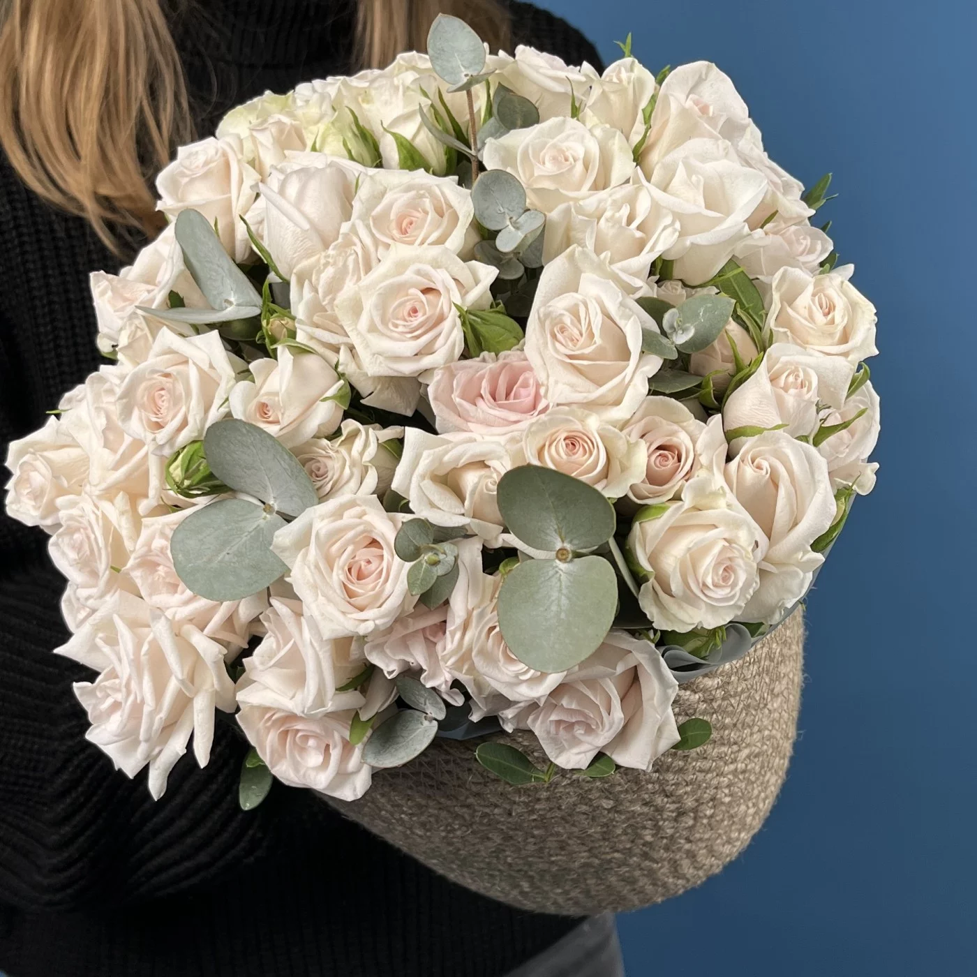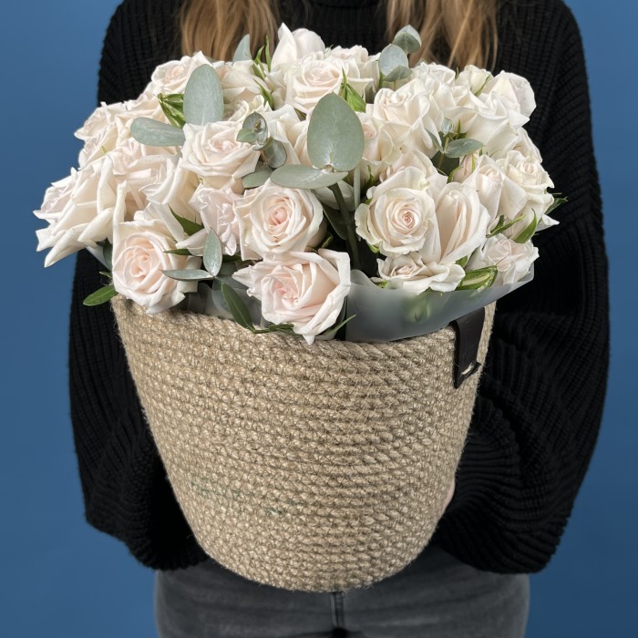 Композиция из 15 кустовых роз Роял Порцелина в кашпо — элегантное сочетание утончённости и гармонии. Нежно-кремовые бутоны с мягким розовым оттенком раскрываются плавными волнами, создавая атмосферу спокойствия и изысканности. Стильное кашпо подчёркивает благородный характер цветов, превращая композицию в утончённый акцент для любого интерьера.