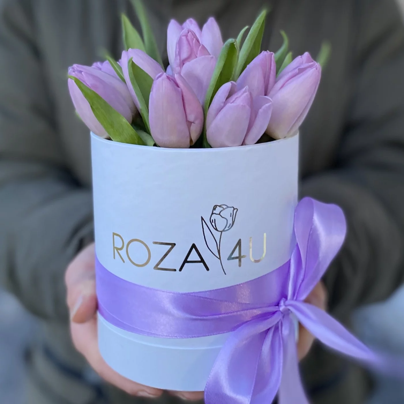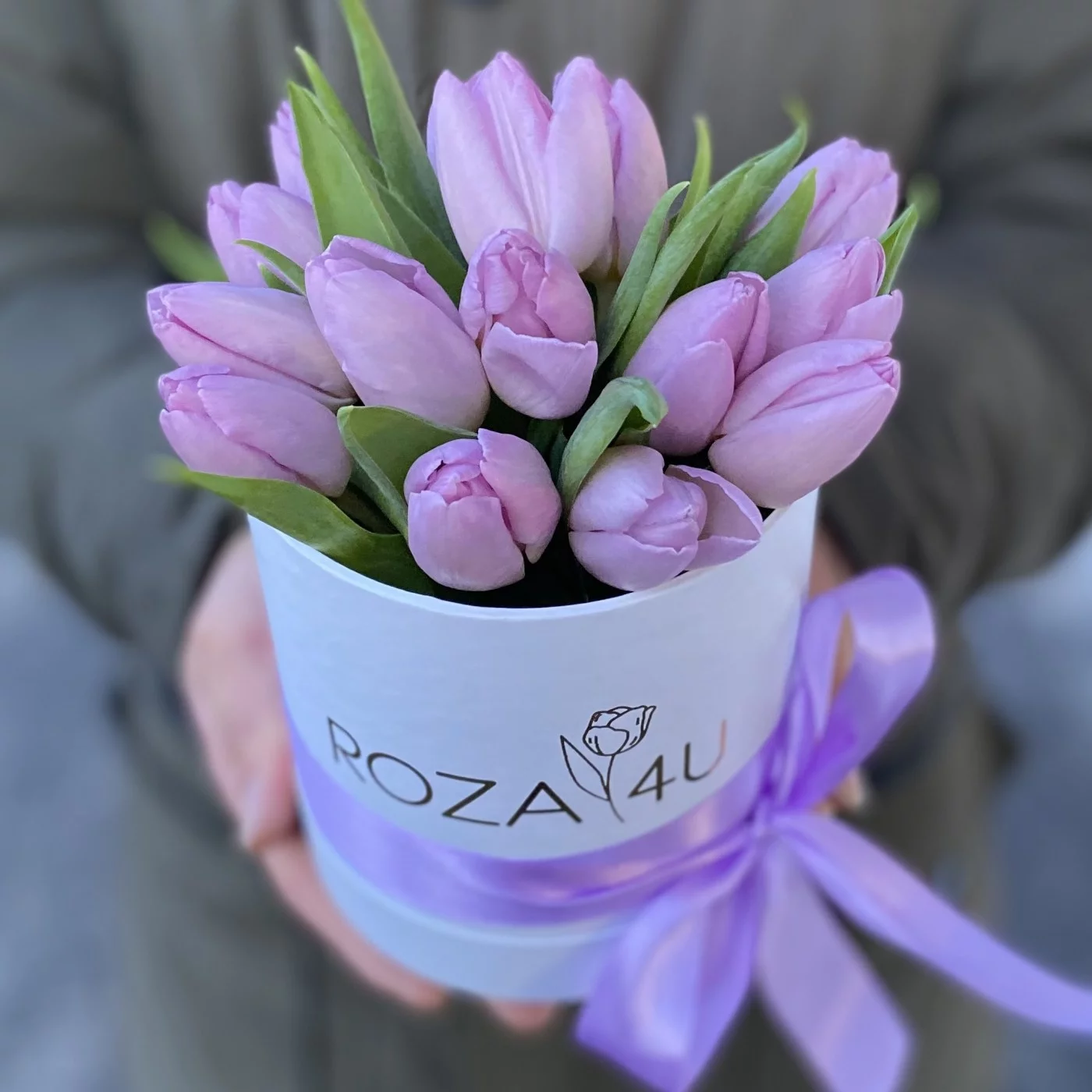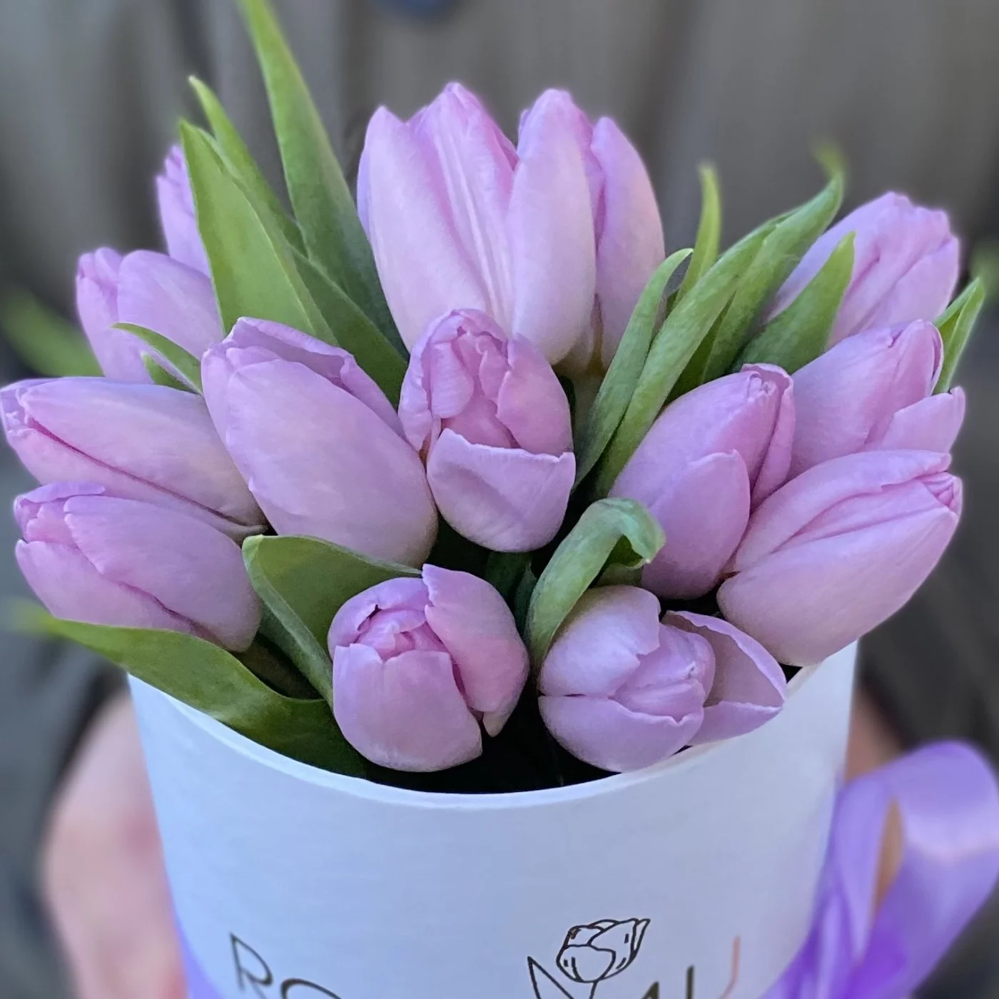 Небольшая коробочка с 15 лиловыми тюльпанами. Преподнесите такую композиция в качестве презента своим любимым людям Прекрасный подарок к 8 марта.