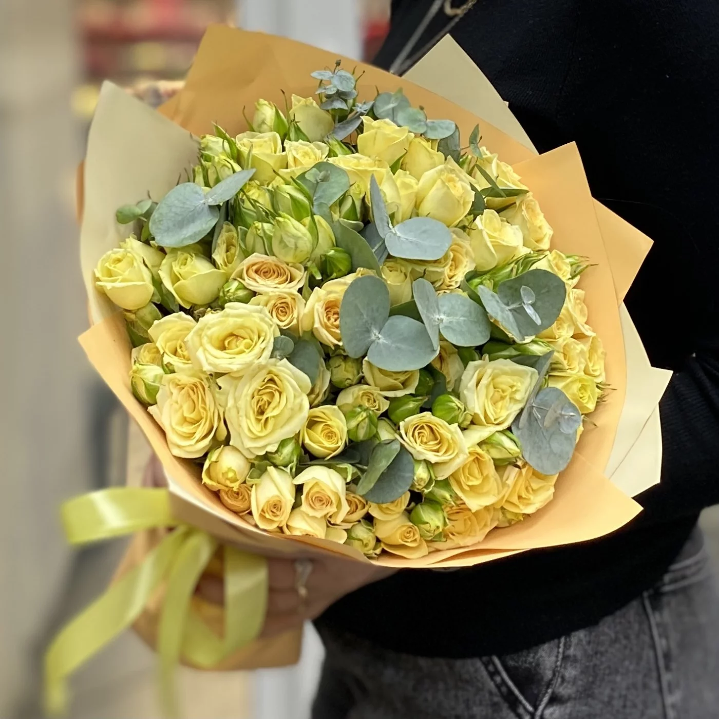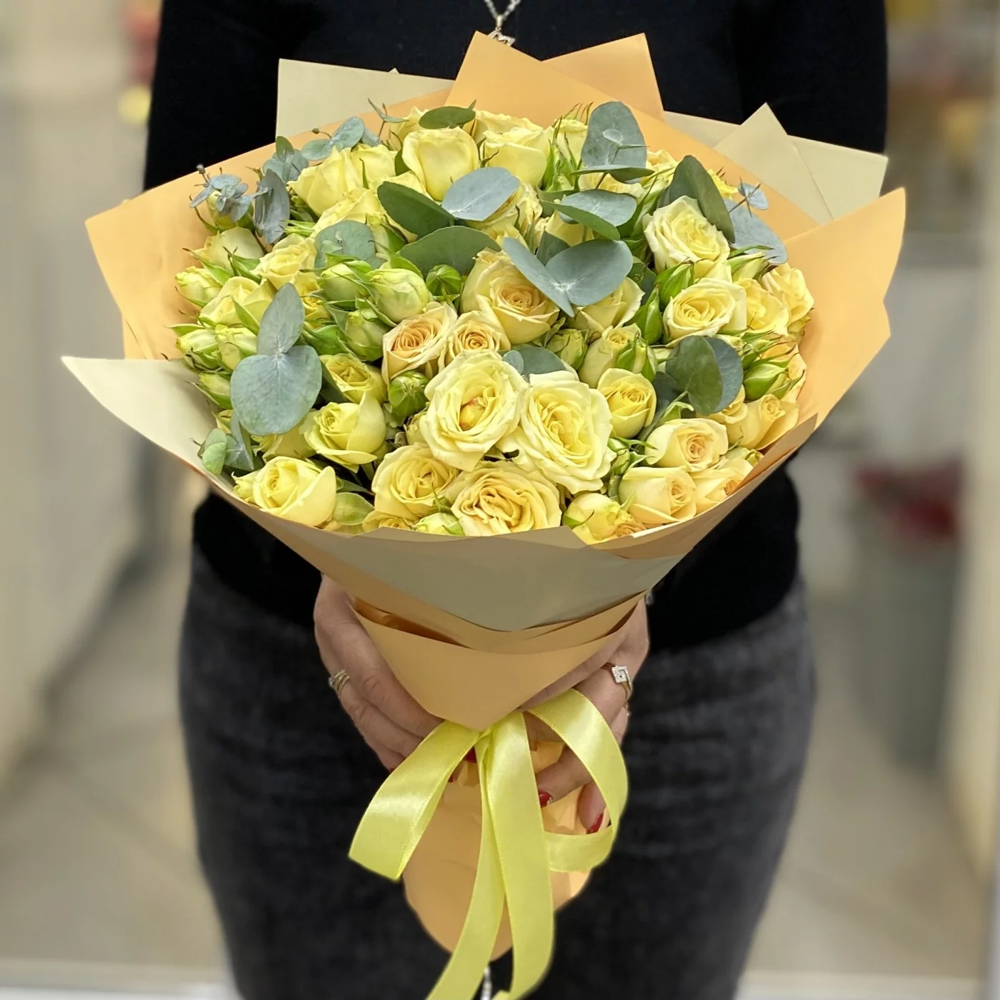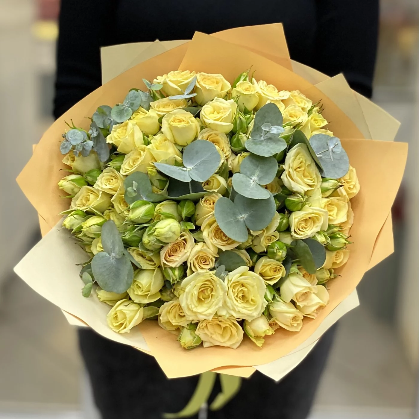 Сочная, играющая всеми переливами оттенков спелого лимона, кустовая роза в дуете с эвкалиптом согреет своего получателя даже зимой.