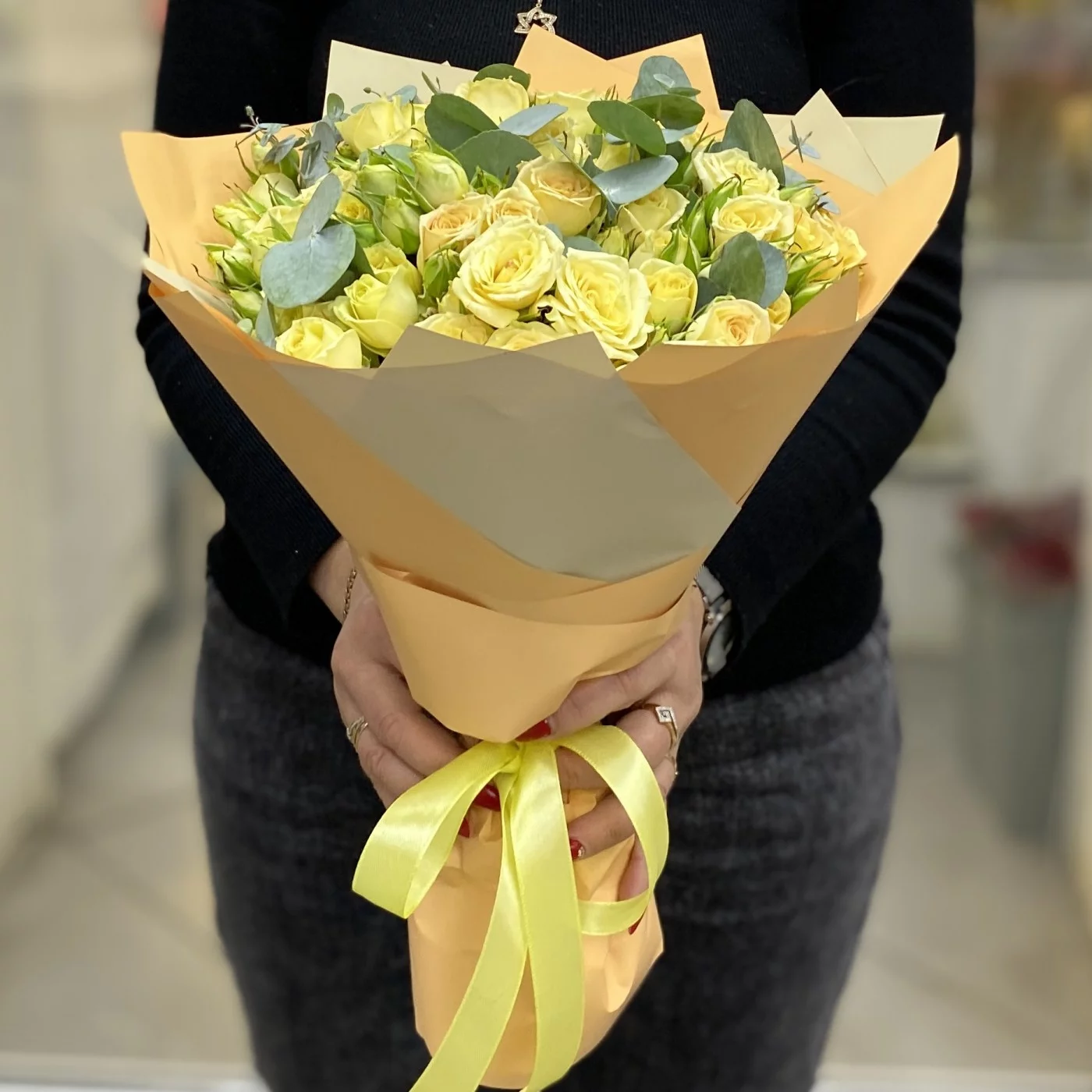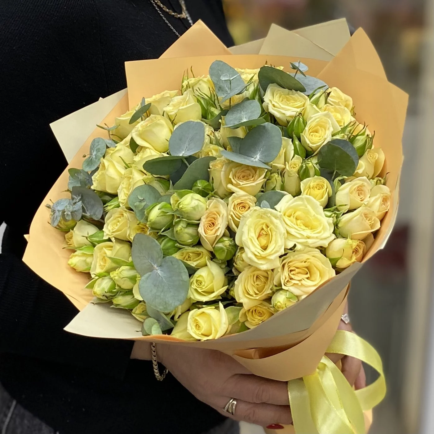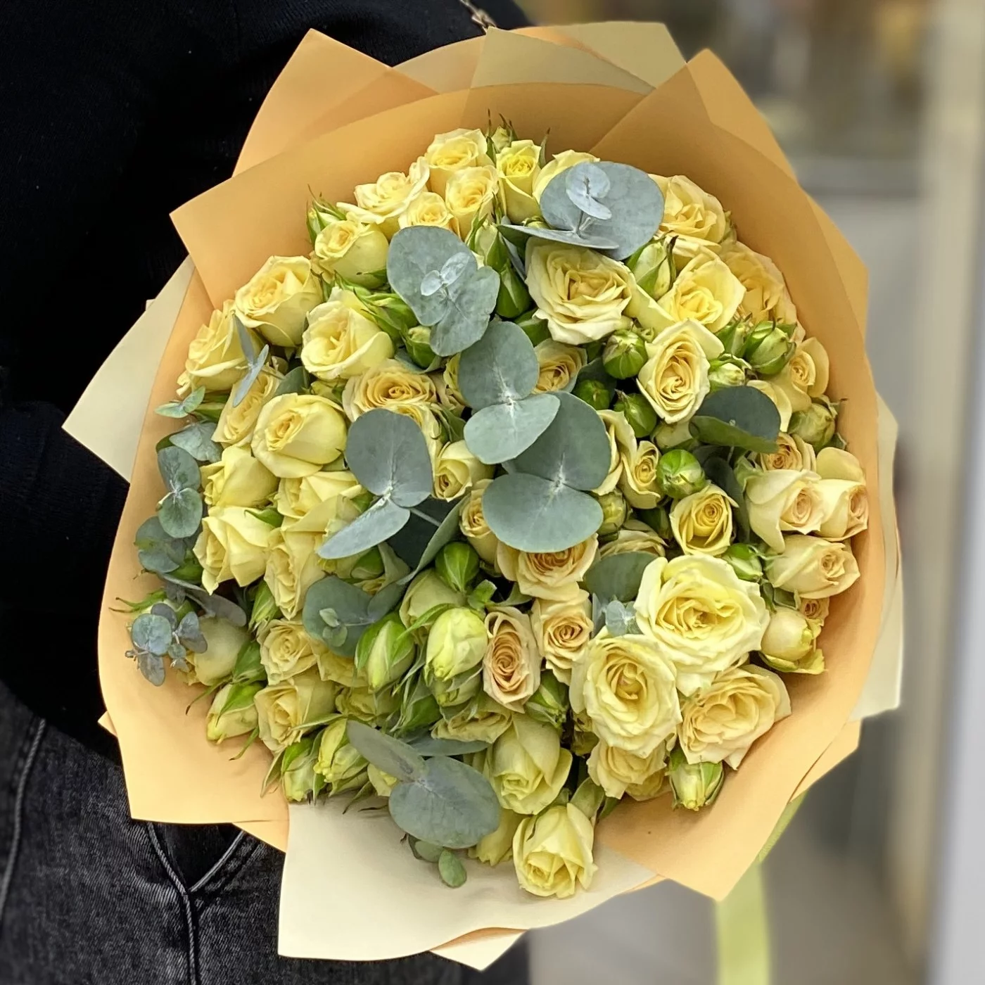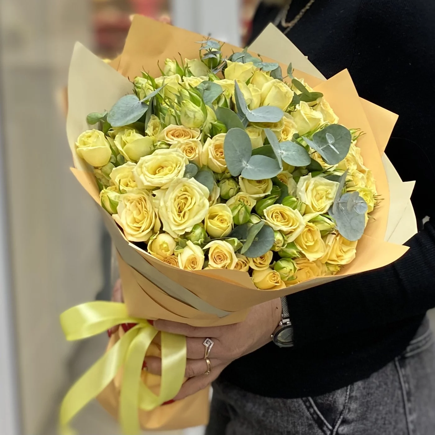 Сочная, играющая всеми переливами оттенков спелого лимона, кустовая роза в дуете с эвкалиптом согреет своего получателя даже зимой.