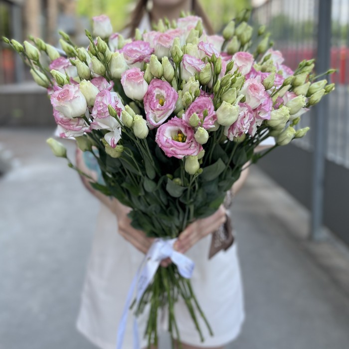 Элегантная эустома махровая бело-розовая — символ нежности и романтики. Пышные, ароматные цветы создают атмосферу тепла и изящества. Идеальный выбор для поздравлений, выражения чувств или украшения особых моментов. Подарите красоту и утонченность с этим изысканным букетом.