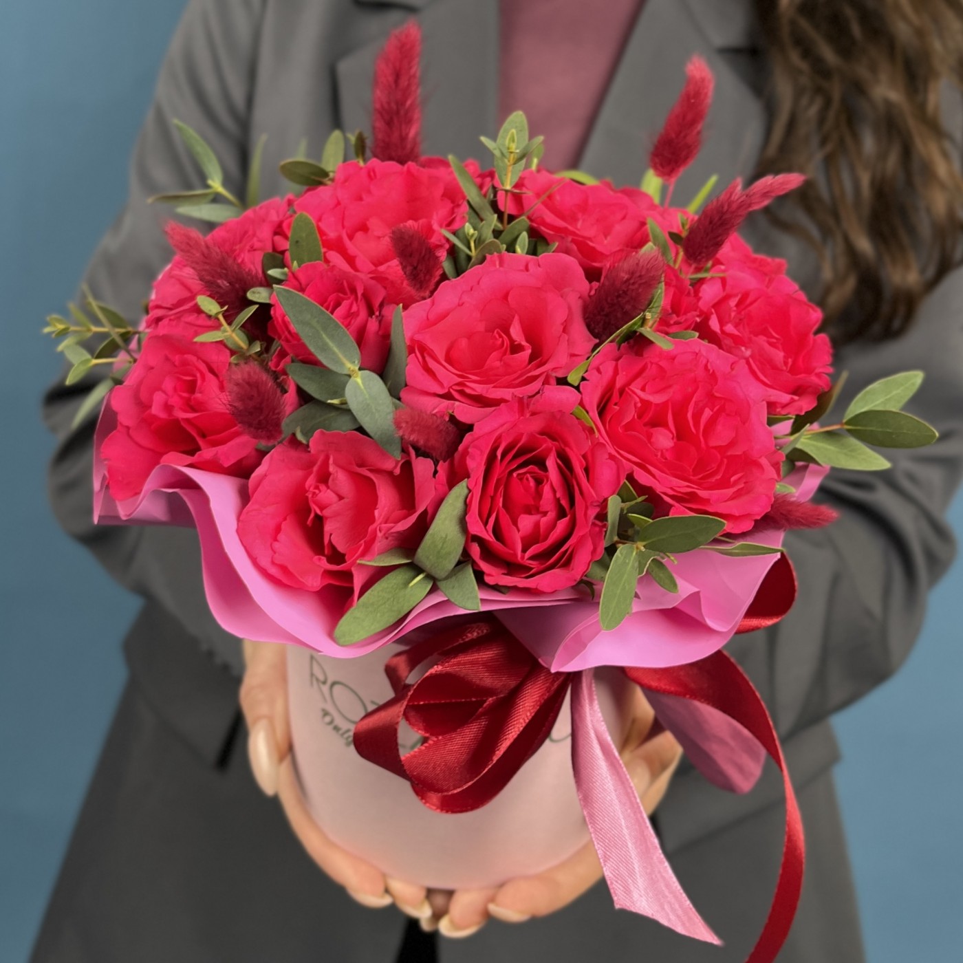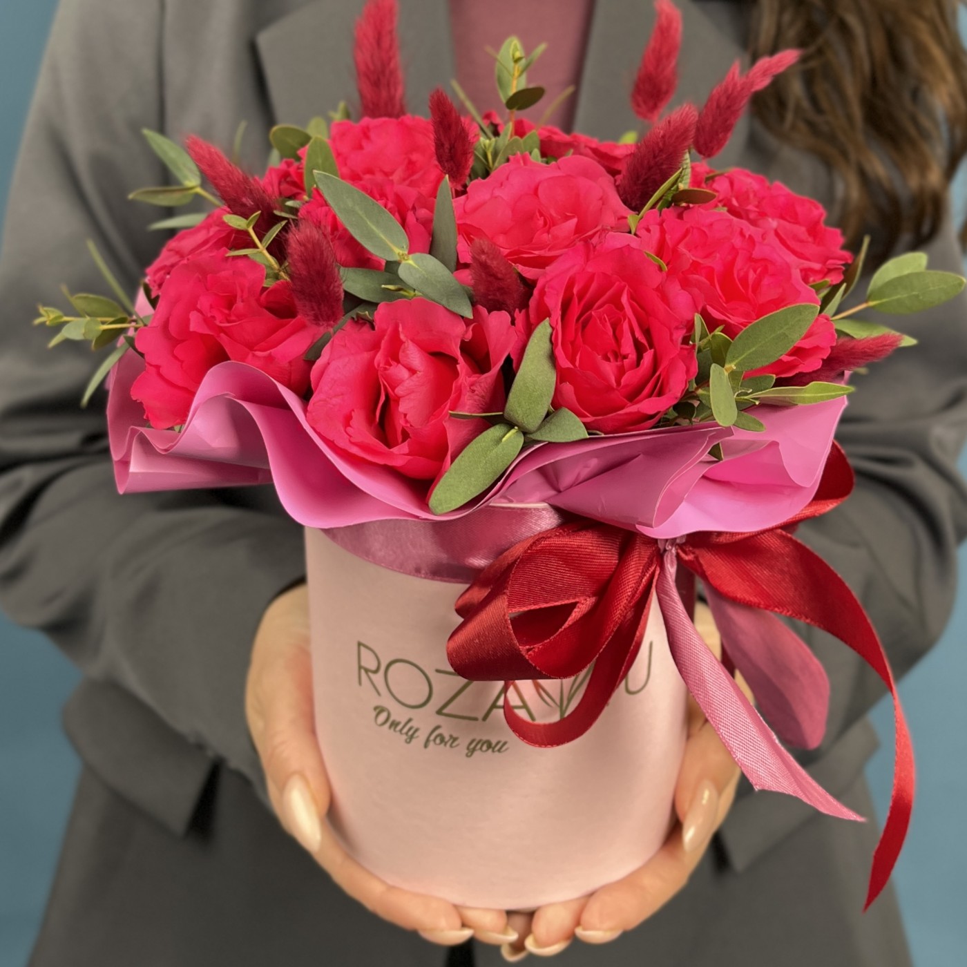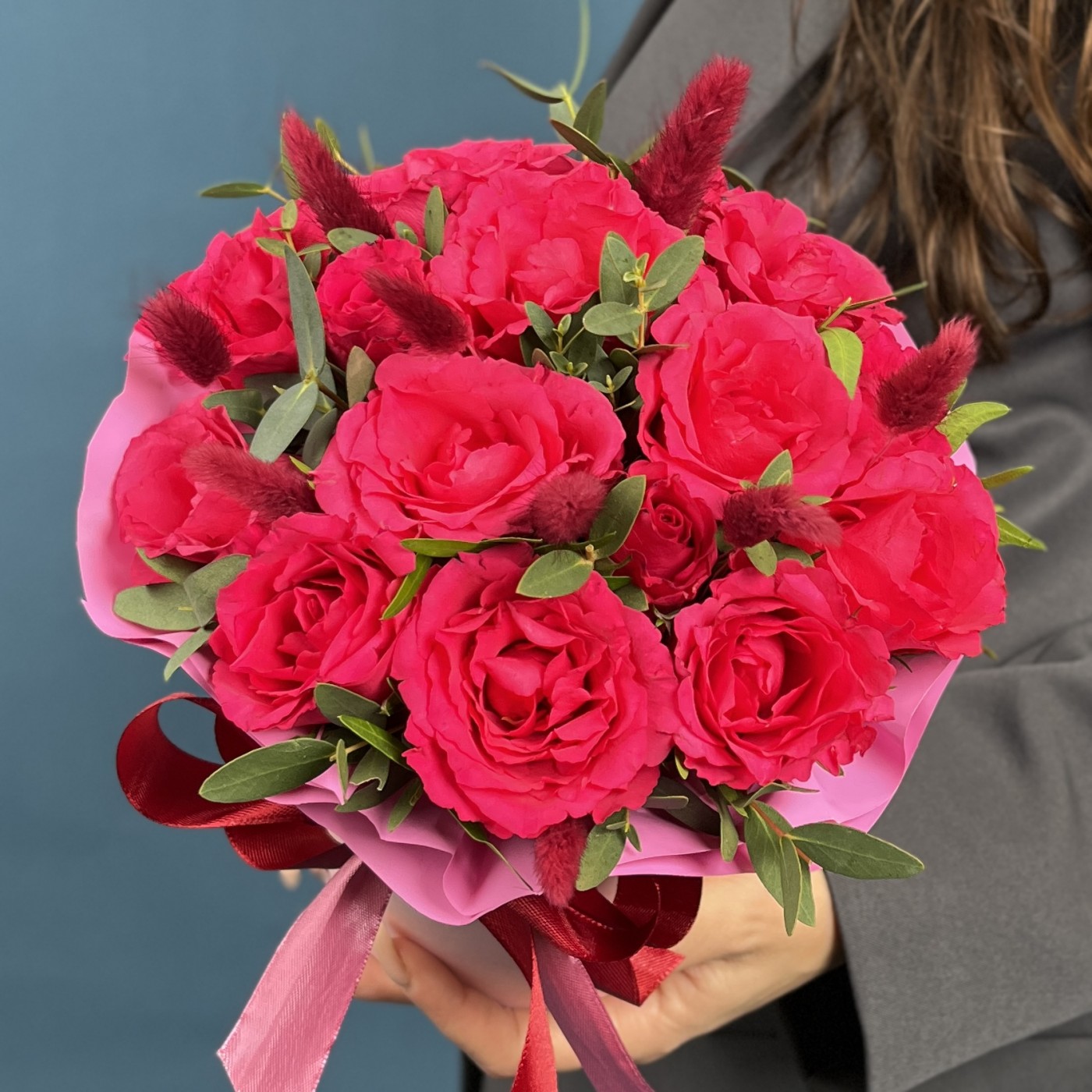 15 малиновых роз Вайлд Калипсо с лагурусом в коробке — это элегантная и романтичная композиция, которая станет прекрасным подарком для любого случая. Яркий малиновый оттенок роз создает насыщенный и выразительный образ, а лагурус добавляет легкость и воздушность.