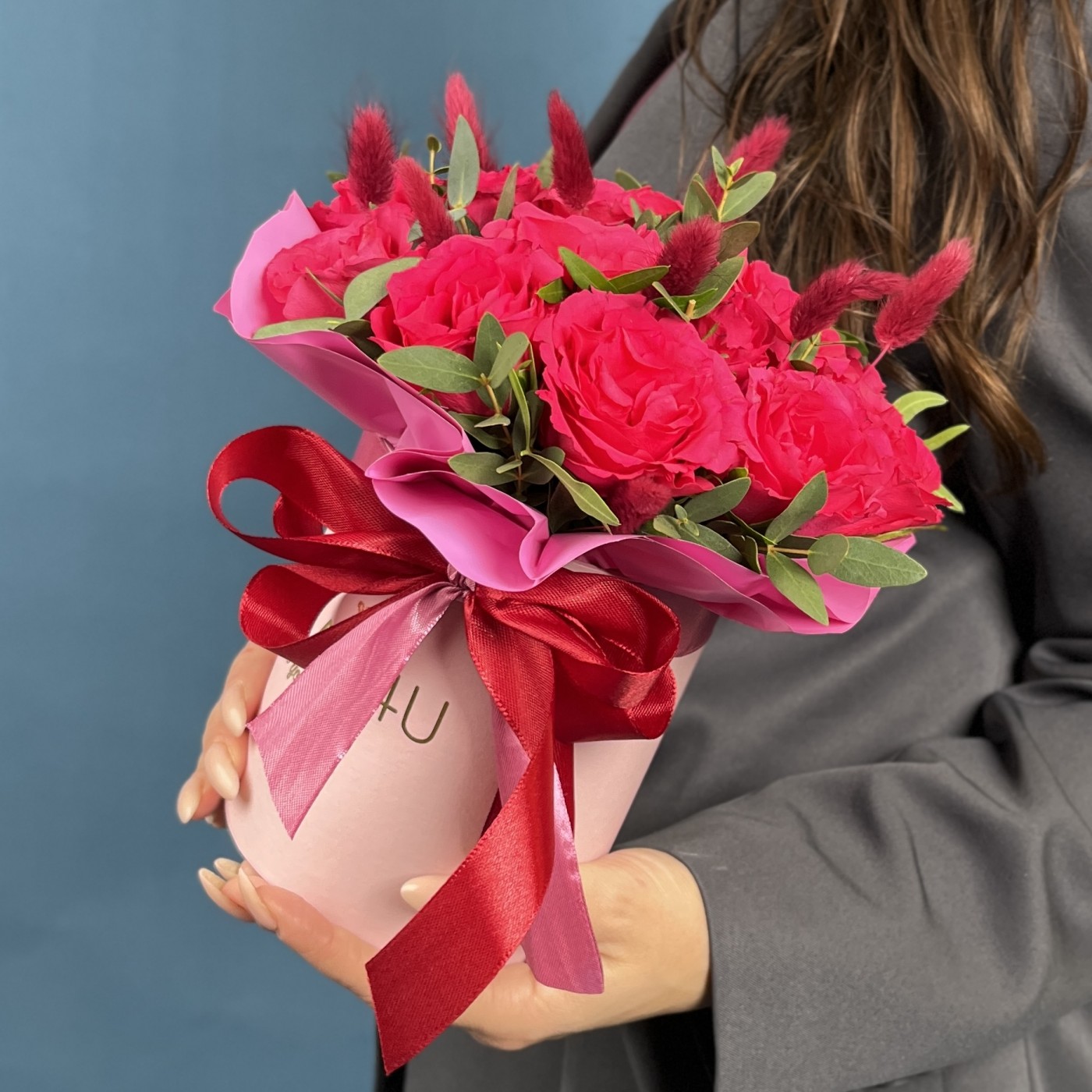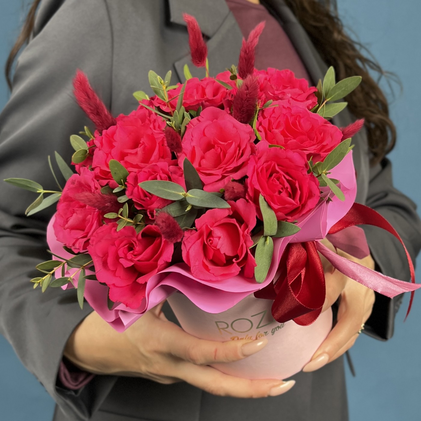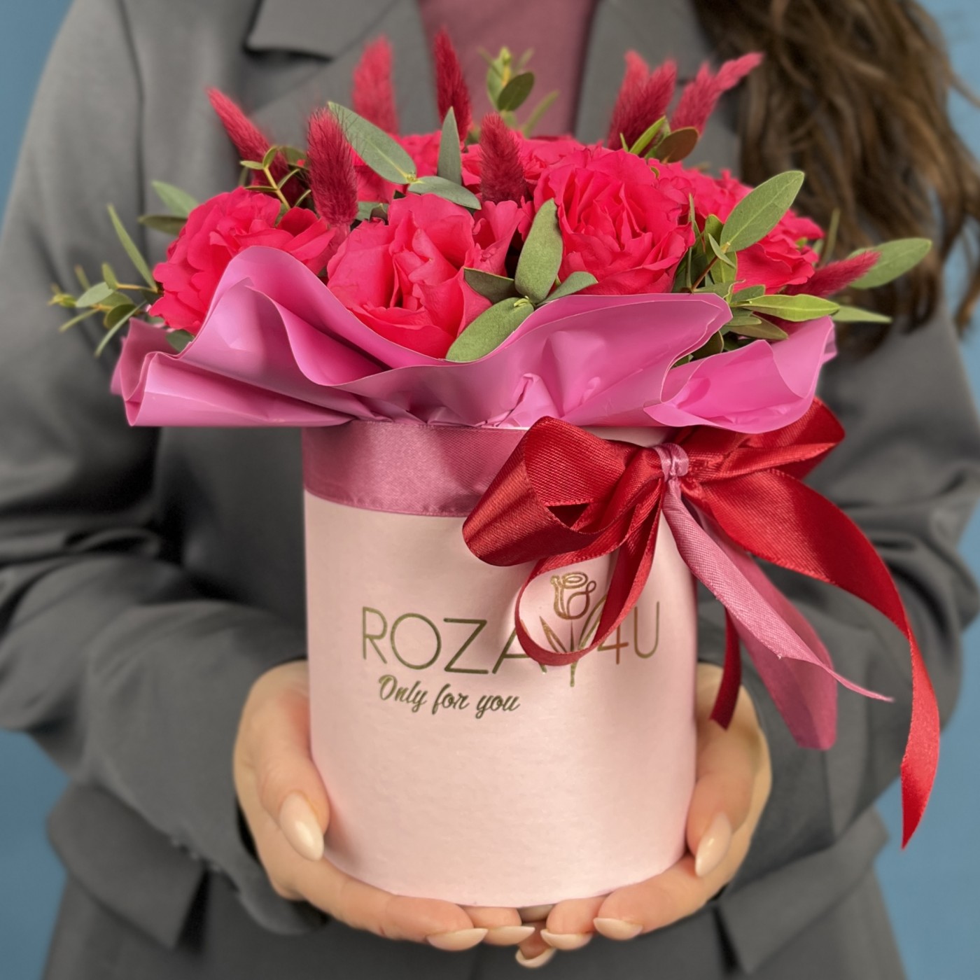 15 малиновых роз Вайлд Калипсо с лагурусом в коробке — это элегантная и романтичная композиция, которая станет прекрасным подарком для любого случая. Яркий малиновый оттенок роз создает насыщенный и выразительный образ, а лагурус добавляет легкость и воздушность.
