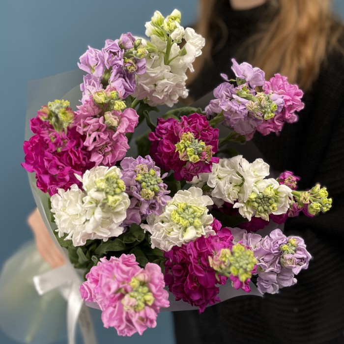 Этот яркий и насыщенный букет состоит из 15 маттиол MIX — разнообразных по цвету и оттенкам цветов, создающих живую и динамичную композицию. Маттиол — это эффектные цветы с крупными, пышными соцветиями, которые в миксе представлены в различных ярких и нежных тонах. Такой букет отлично подойдет для праздничных мероприятий, поздравлений или чтобы порадовать близких ярким акцентом. Его разнообразие цветов и насыщенность создают атмосферу радости, тепла и искренних чувств.