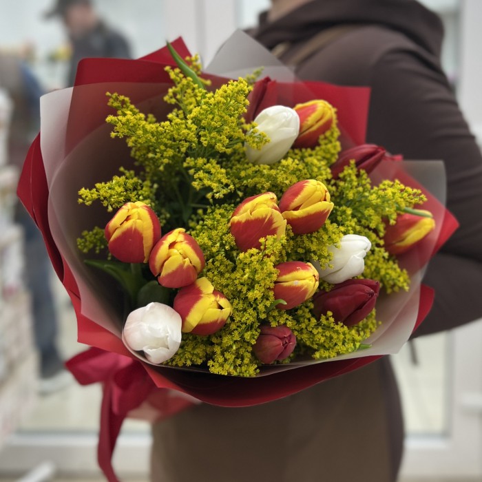 Этот живой и по-настоящему солнечный букет состоит из 15 ярких тюльпанов, гармонично дополненных нежными веточками солидаго. Контраст насыщенных тюльпанов и лёгких золотистых акцентов создаёт ощущение свежести, тепла и весеннего настроения.
