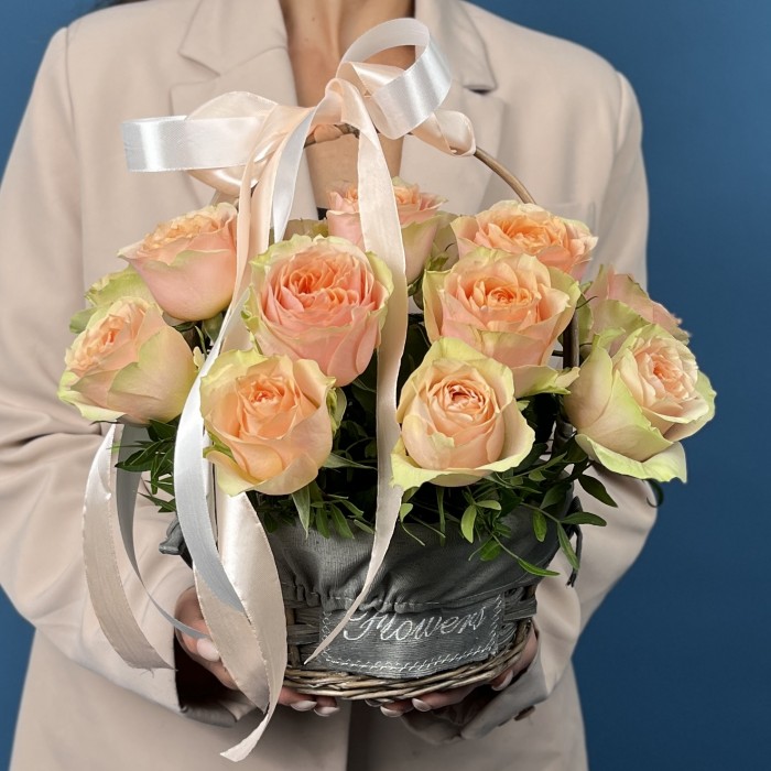 Изысканная компoзиция из 15 пионовидных кремовых роз сорта Гравити, аккуратно размещённых в элегантной корзине. Нежные оттенки и пышная форма роз создают романтичную и утонченную атмосферу, делая этот букет прекрасным подарком или украшением для особых случаев.
