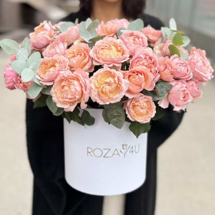 Шикарная шляпная коробка из кустовой пионовидной розы Дэульетта с ароматным эвкалиптом принесет улыбку и радостное настроение получательнице. Эти цветы станут прекрасным комплиментом женской красоте и расскажут о ваших чувствах.