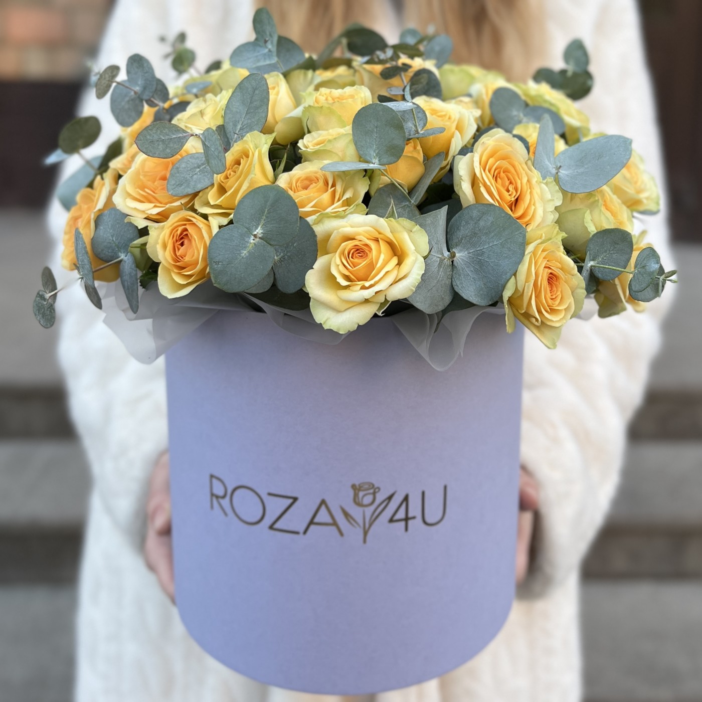 Яркая желтая пионовидная кустовая роза Бандолера в коробке с ароматным эвкалиптом, станет отличным подарком для любимой.