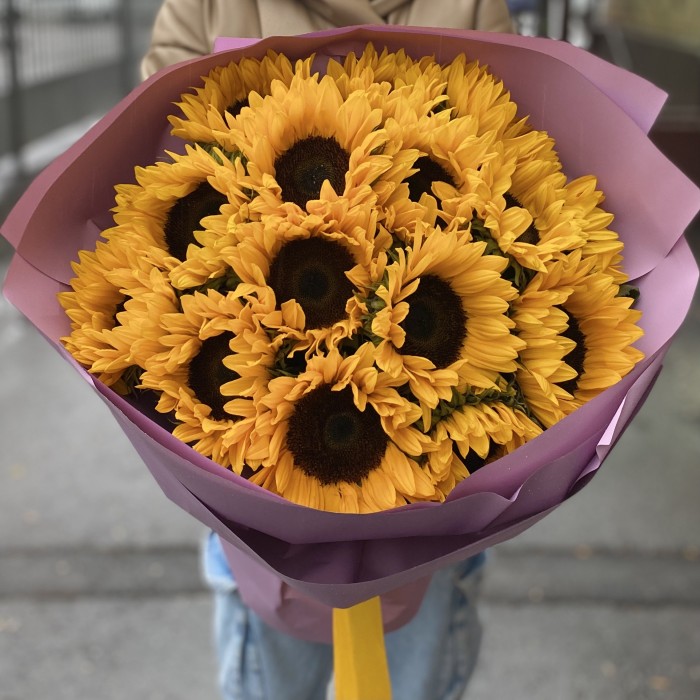Букет из 15 подсолнухов порадует получательницу своим ярким цветом и отлично подойдет, чтобы поднять настроение даже в самый хмурый день.