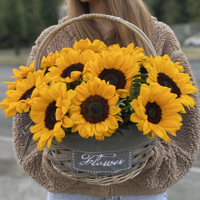 Композиция из 15 подсолнухов в корзине — это яркое и жизнеутверждающее цветочное оформление, которое приносит тепло и радость. Этот букет станет прекрасным дополнением к любому событию, а также замечательным подарком для близких.