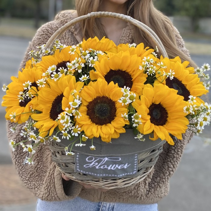 Композиция из 15 подсолнухов с ароматной ромашкой в корзине — это яркое и жизнеутверждающее цветочное оформление, которое приносит тепло и радость. Этот букет станет прекрасным дополнением к любому событию, а также замечательным подарком для близких.