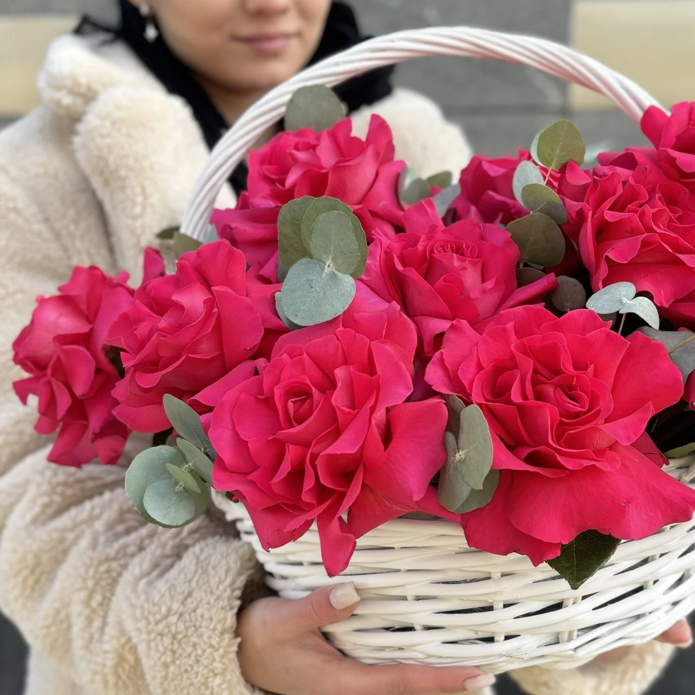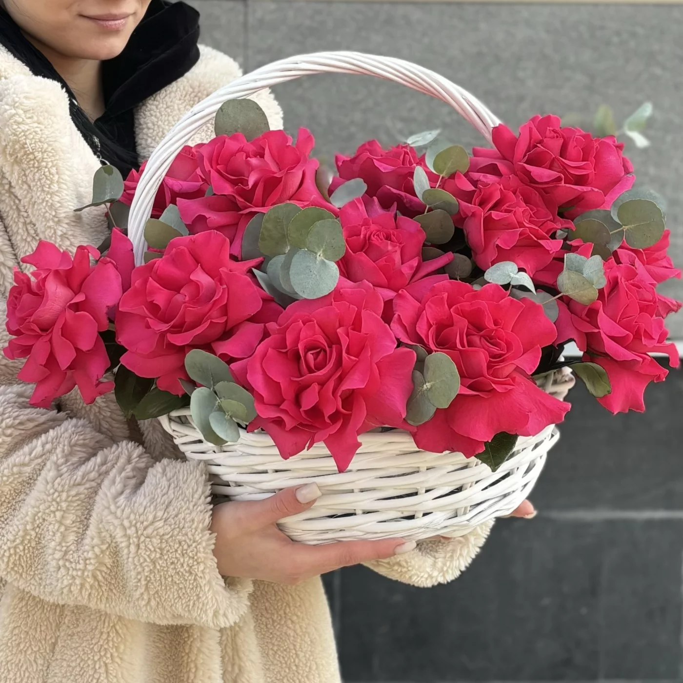 Букет из 15 пышных роз сорта «Пинк Флойд» с эвкалиптом в корзине — это великолепное цветочное оформление, которое станет замечательным подарком для любого повода, будь то день рождения, юбилей или просто знак внимания.