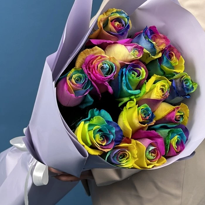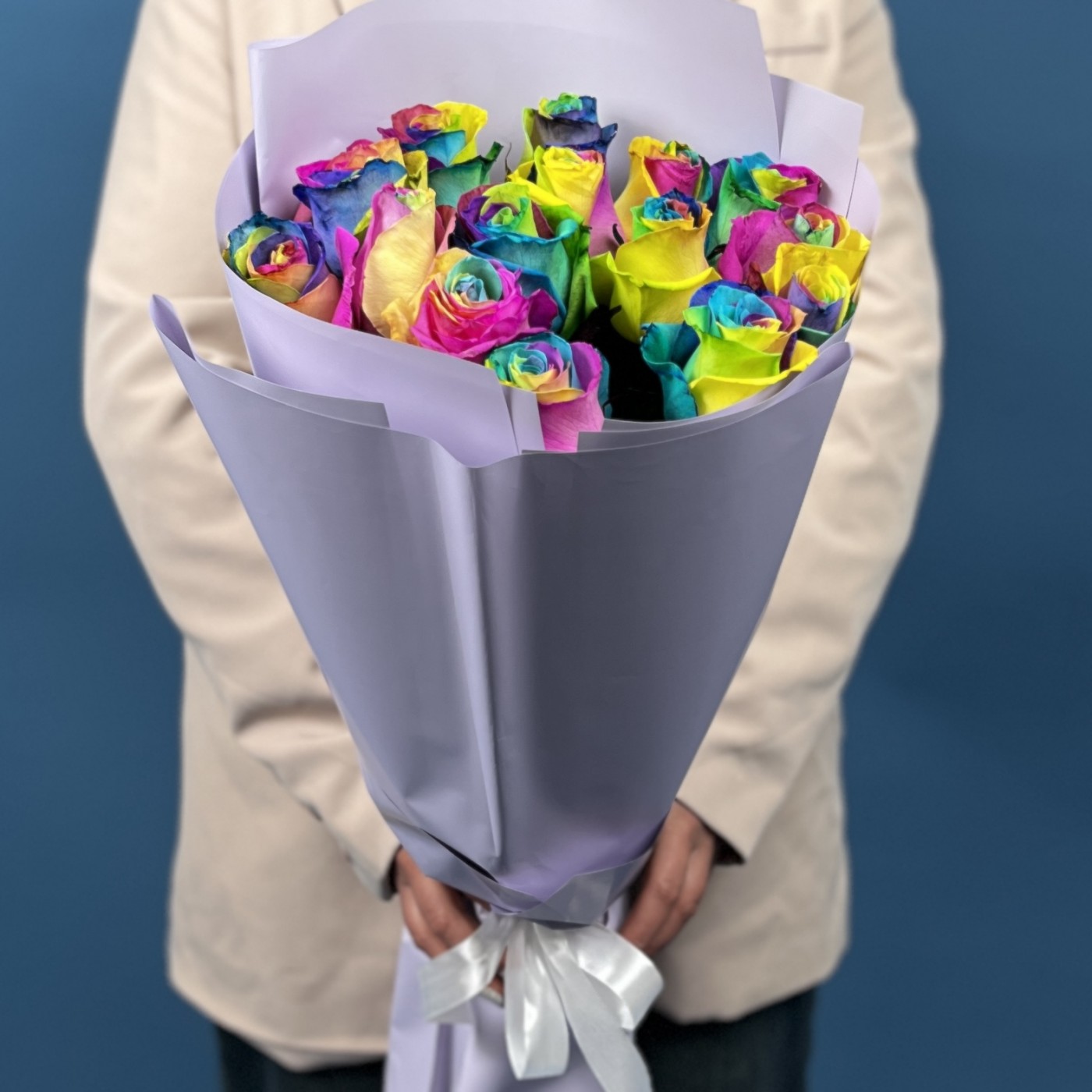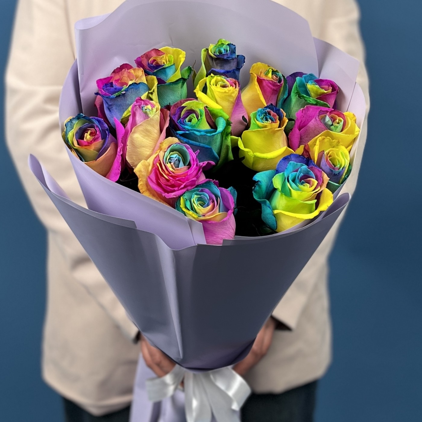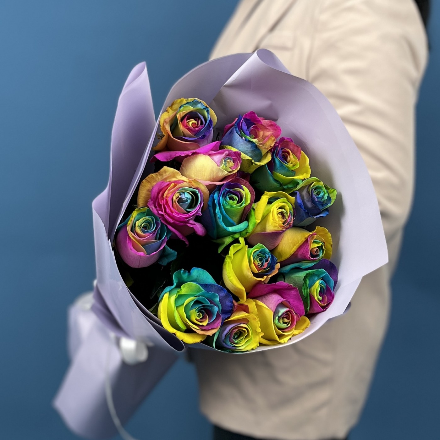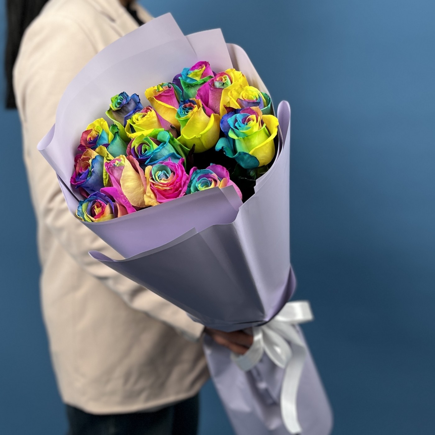 Яркий и эффектный букет состоит из 15 роз различной цветовой палитры, создающих радугу.