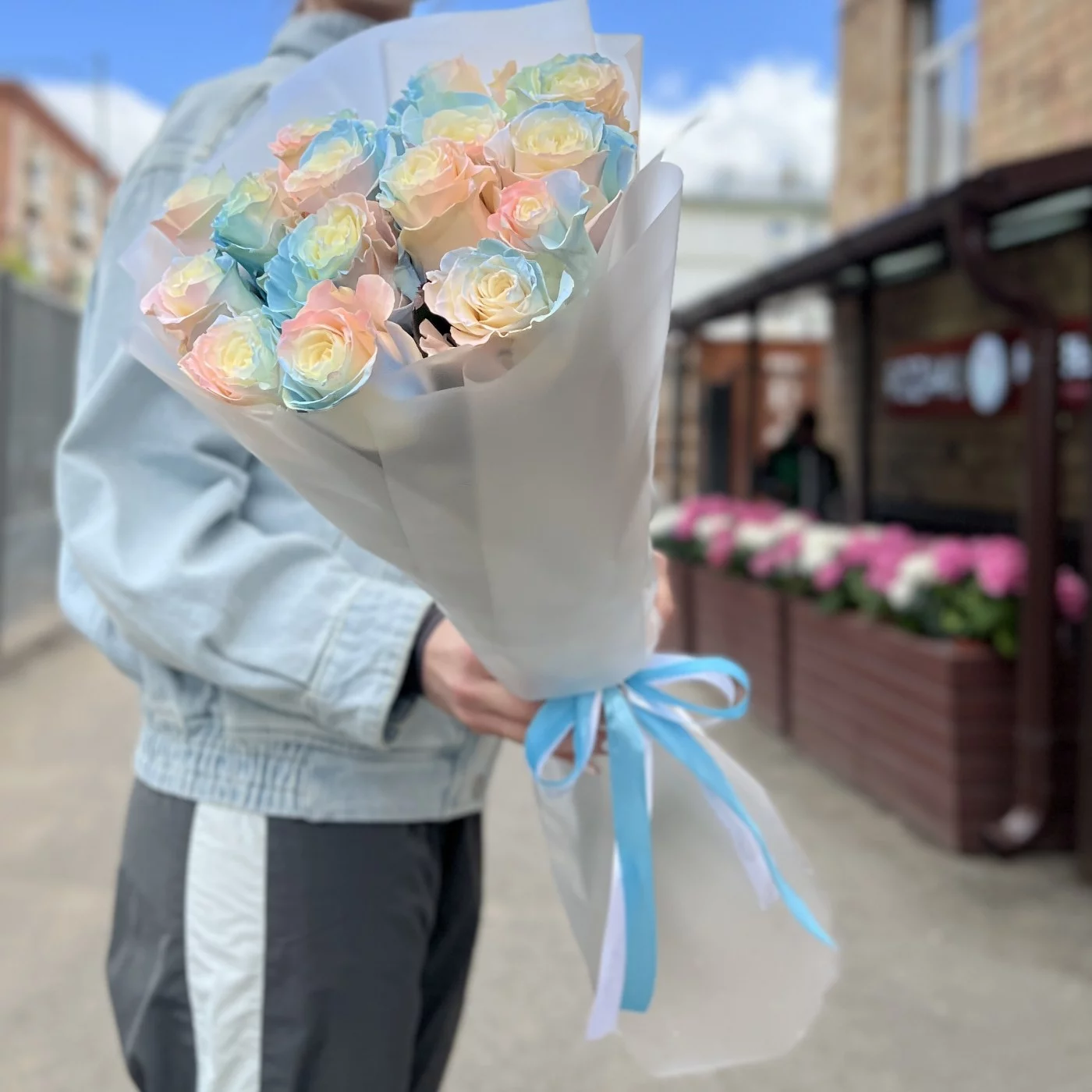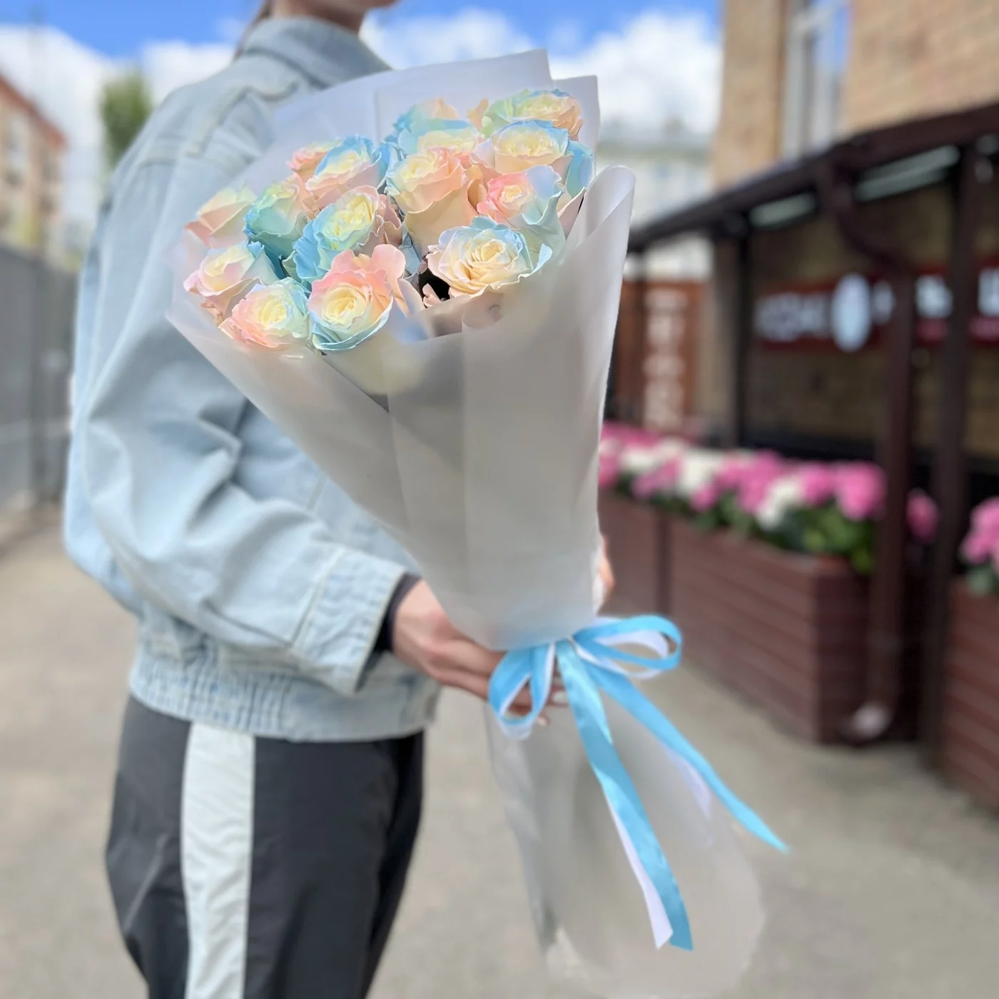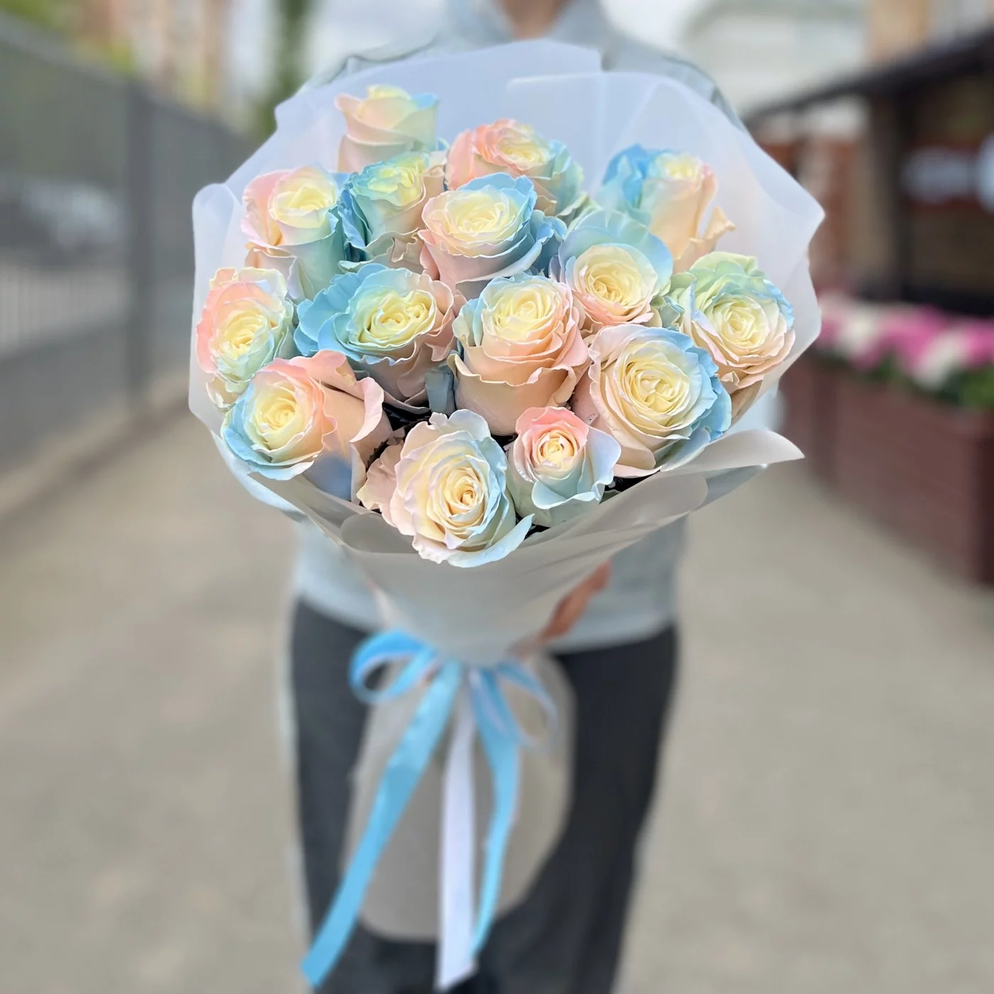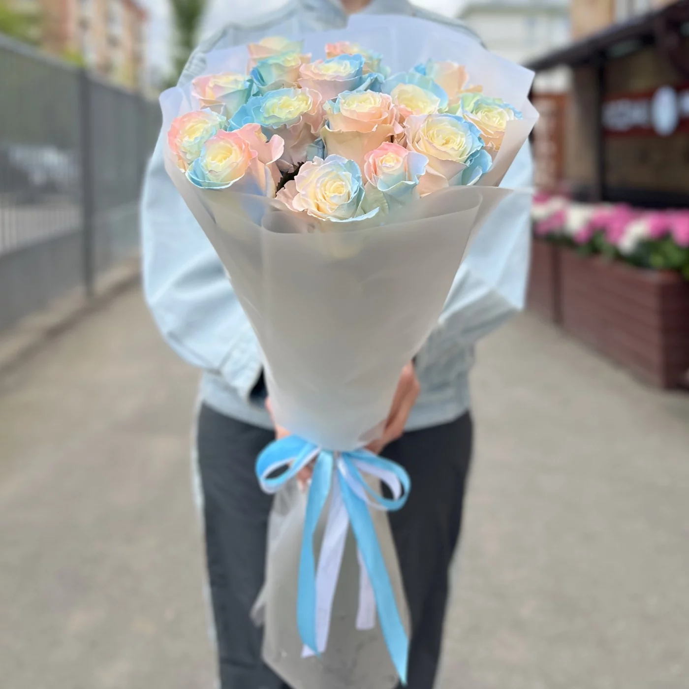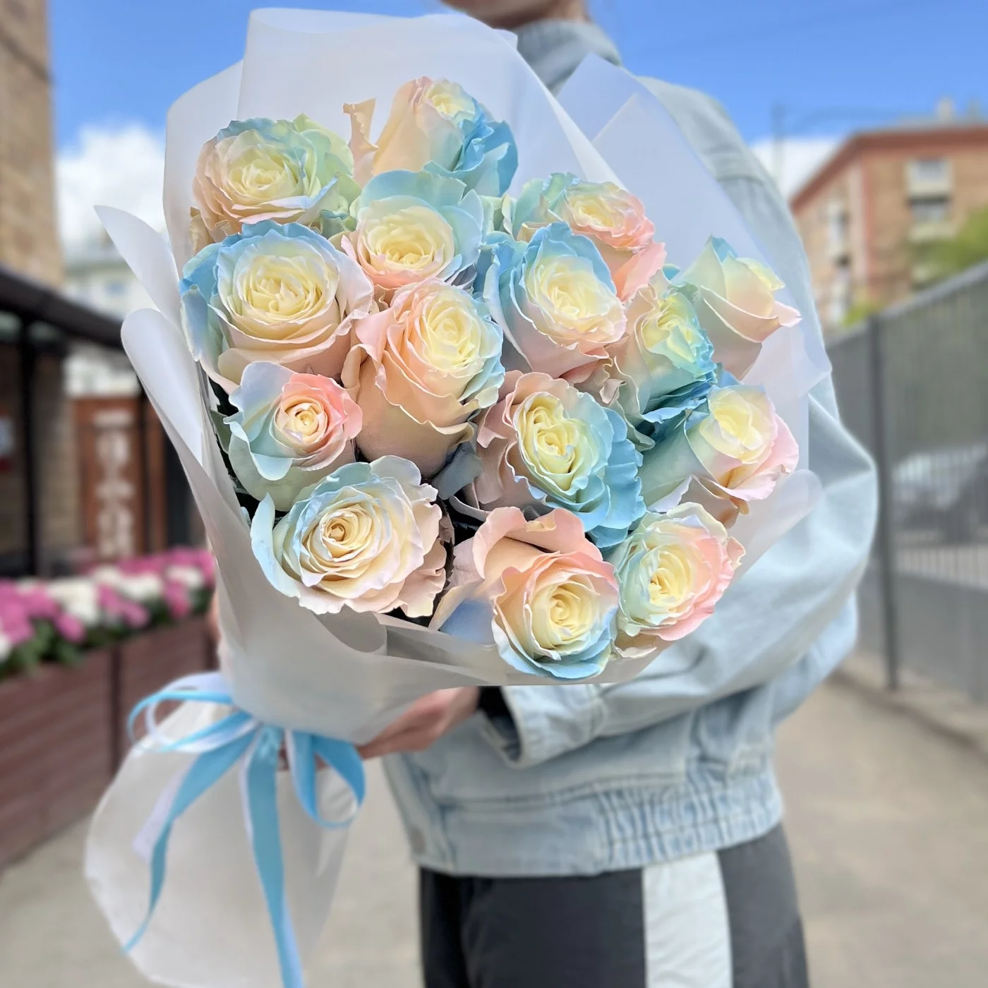 Букет из 15 радужных розово-бело-голубых роз длиной 60 см — это не только красивый, но и оригинальный подарок, который способен произвести впечатление на любого получателя. Эти цветы идеально подходят для выражения самых искренних эмоций и создания незабываемого праздничного настроения.