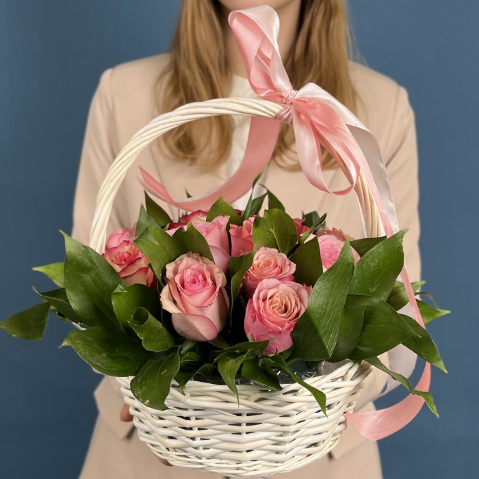 15 роз Алани микс в корзине — это компактная и элегантная композиция, которая станет отличным подарком для любого случая.