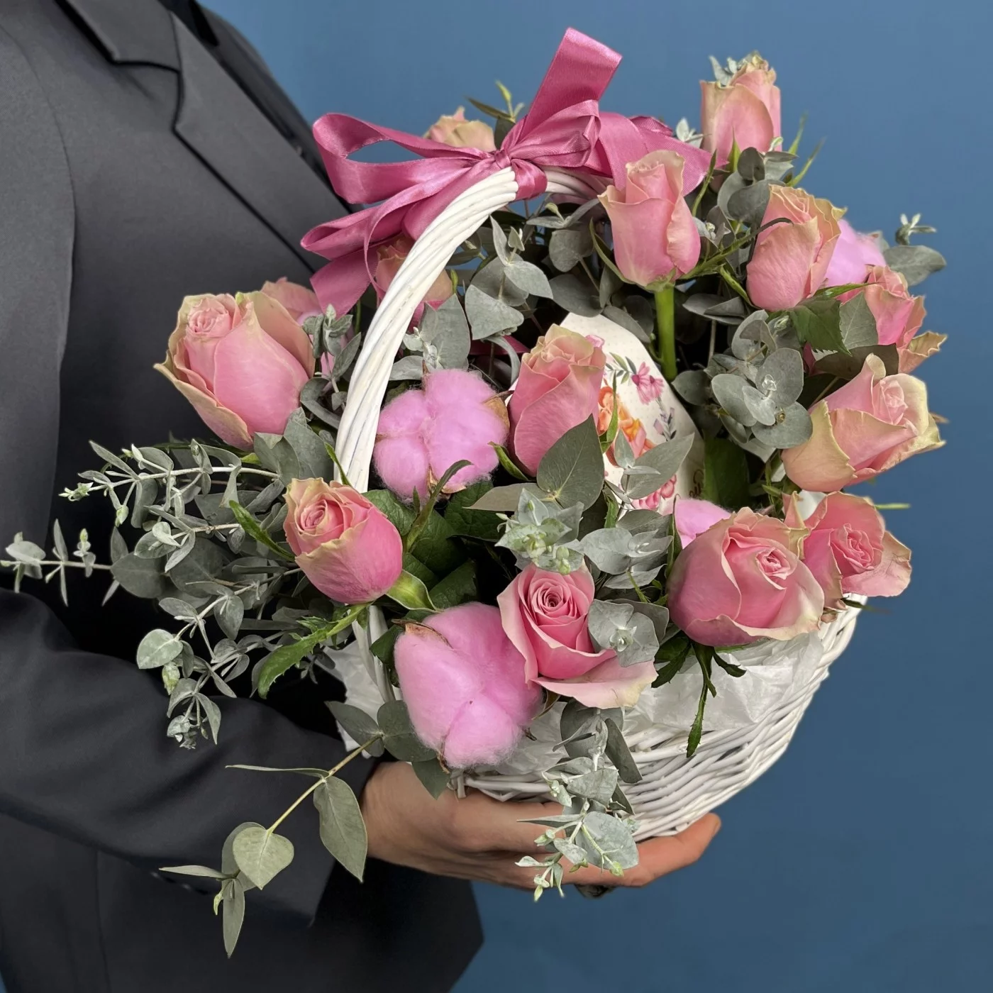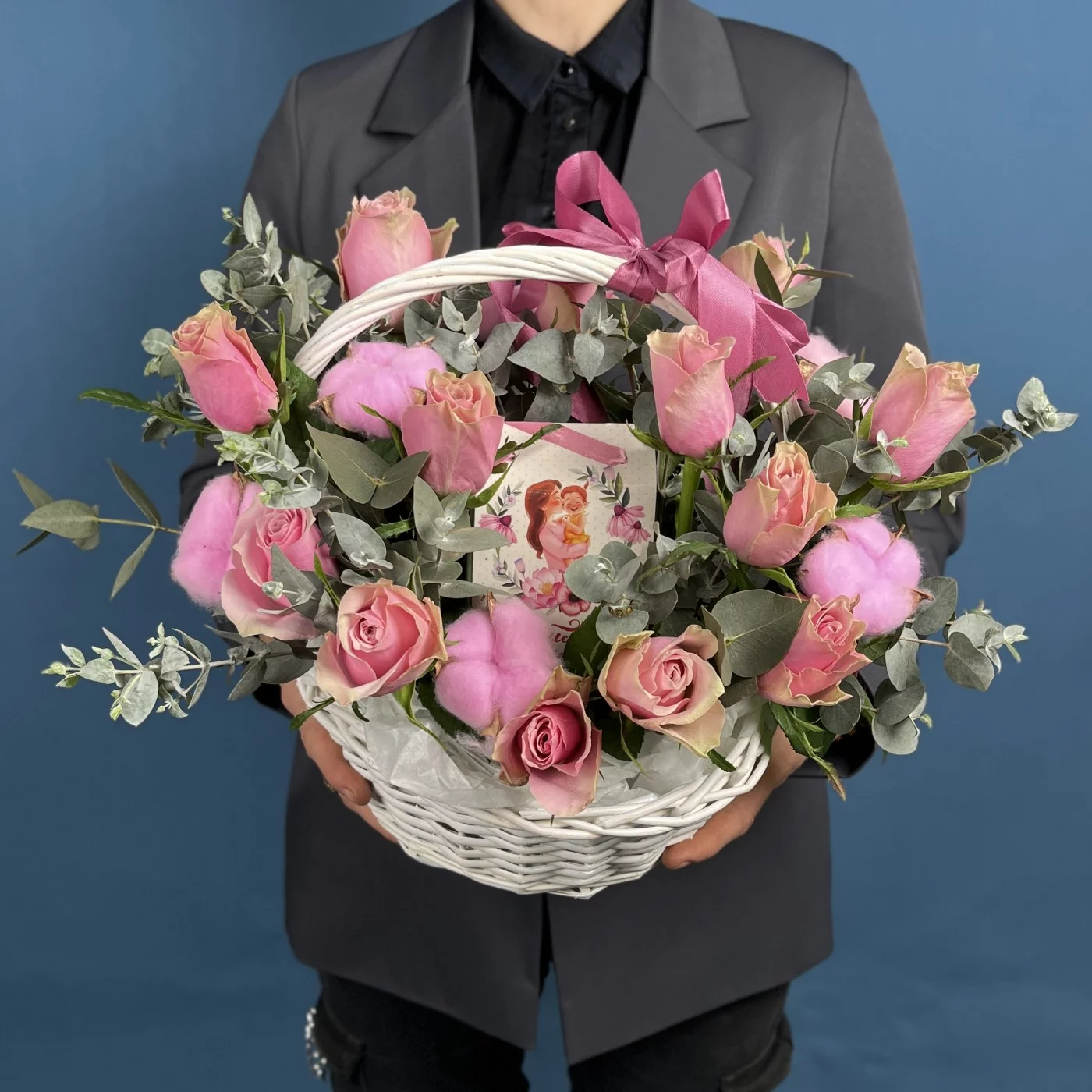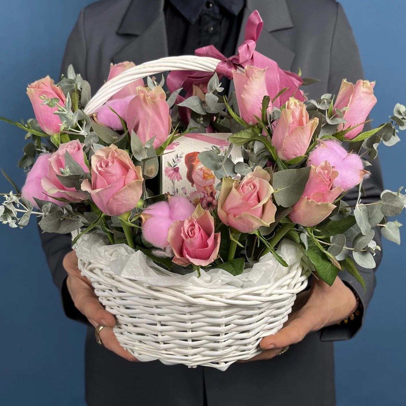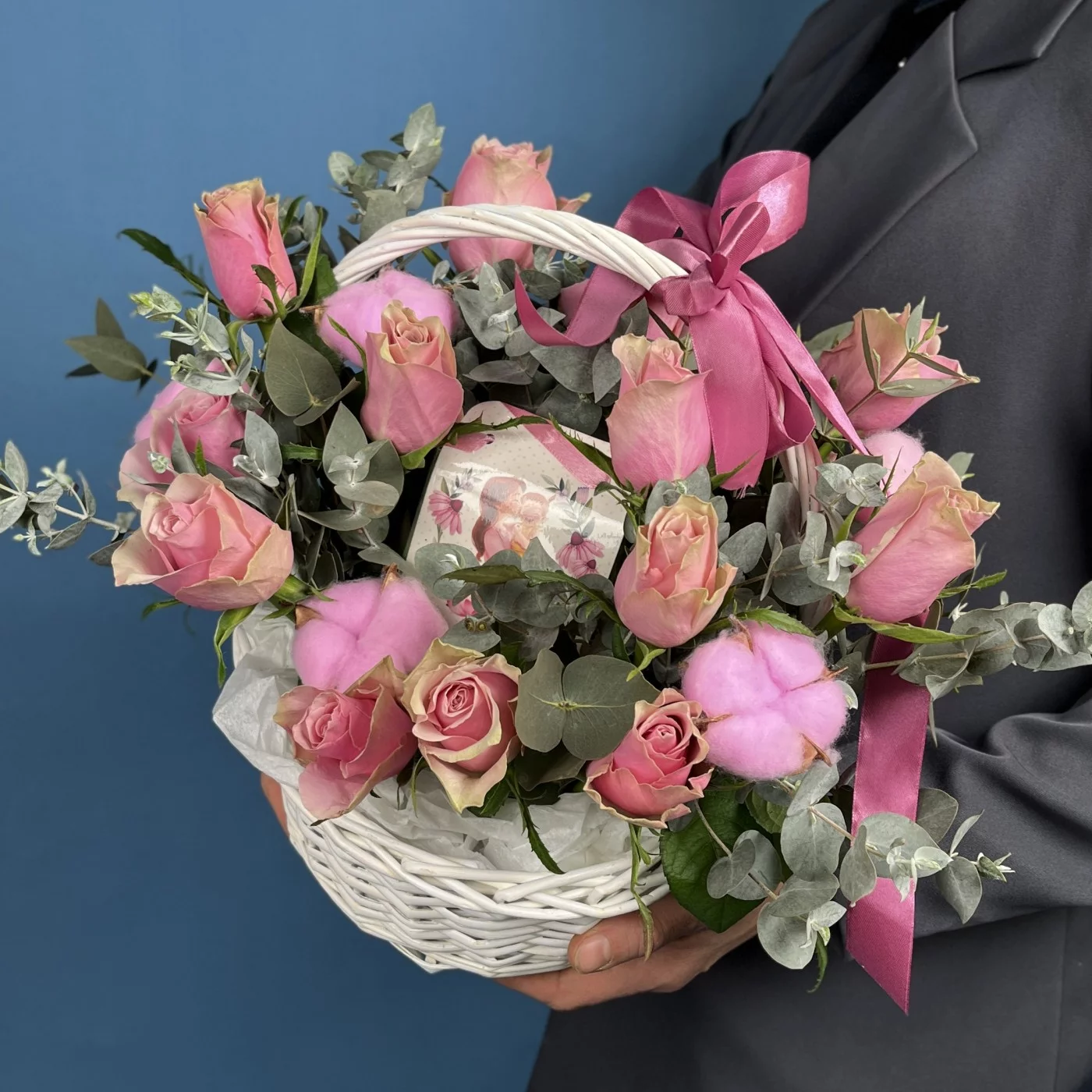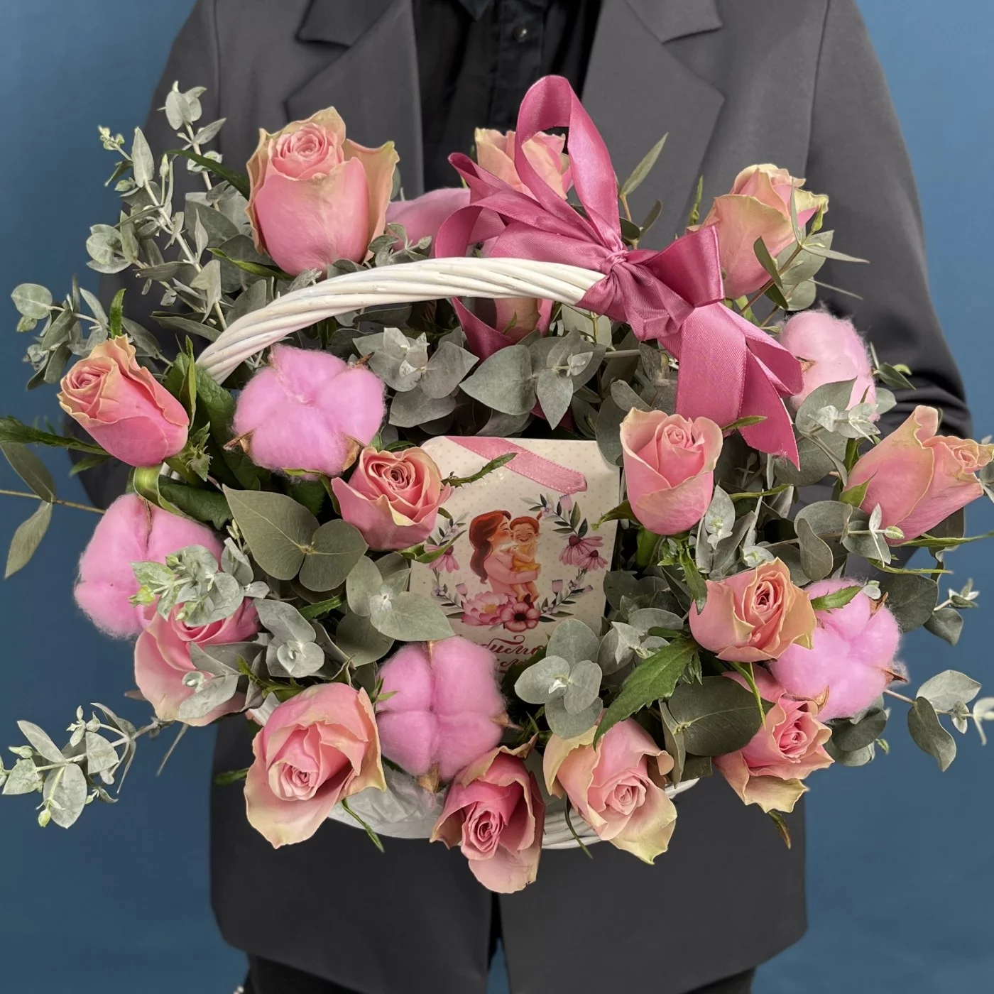 15 роз Роял Атена с чаем Любимой Мамочке в корзине