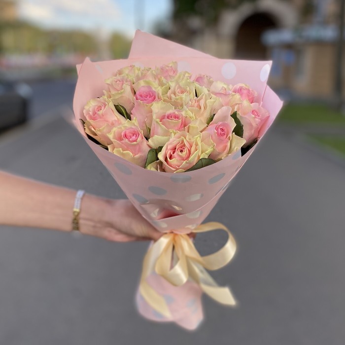 Букет из нежно-розовых роз сорта Топ Гир в упаковке. Такой букет можно преподнести в качестве комплимента или подарить учителю на день знаний или выпускной.