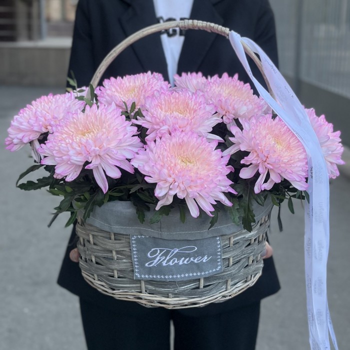 15 розовых хризантем в корзине — это очень красивый и нежный подарок. Такие цветы символизируют радость, благополучие и дружеские чувства.