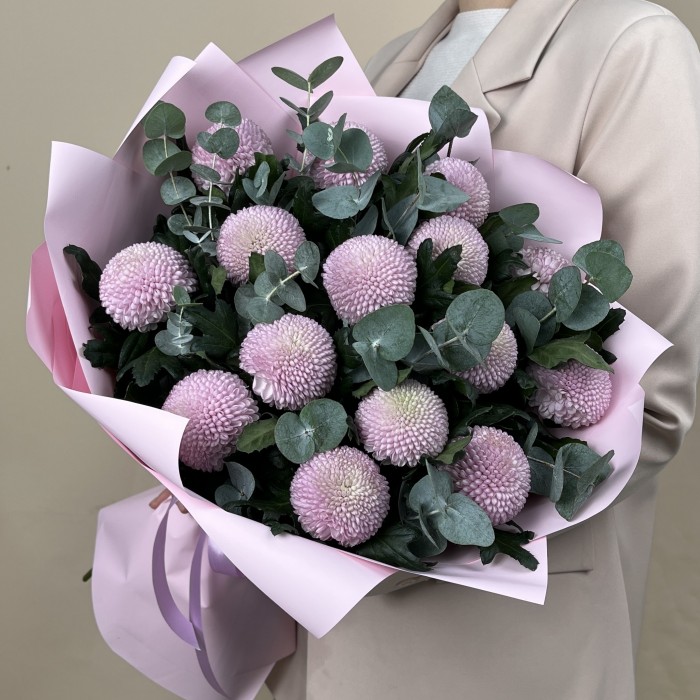 Букет из 15 розовых хризантем Помпон с эвкалиптом — это стильный и свежий подарок, который подойдет для разных случаев, включая дни рождения, праздники или просто как приятный сюрприз для близкого человека.