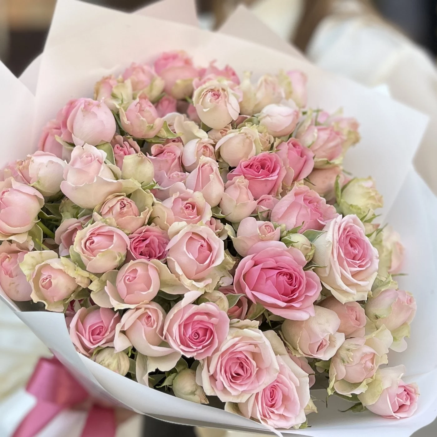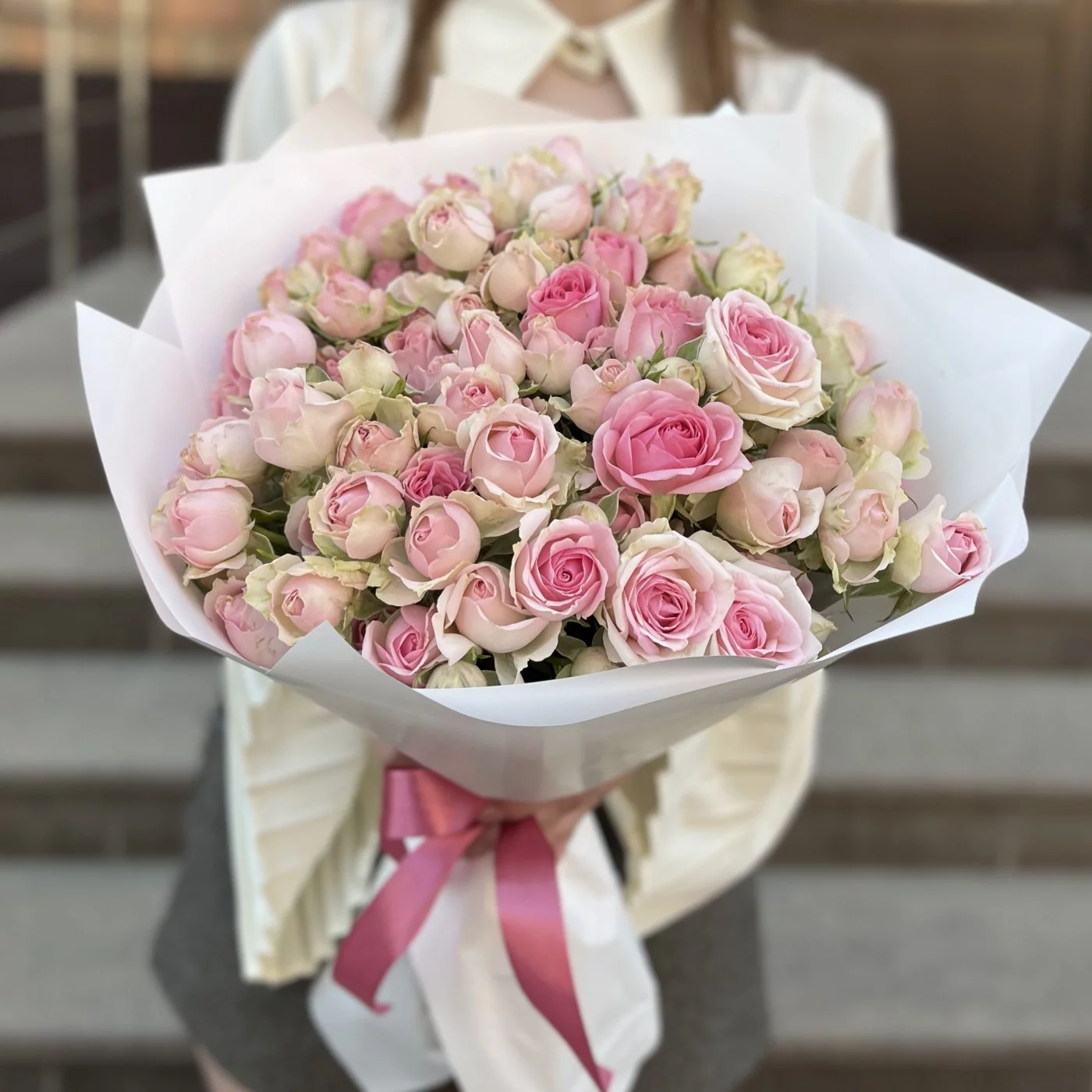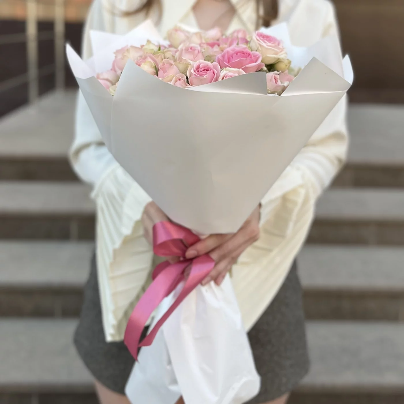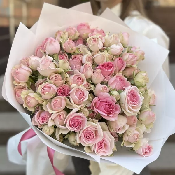 Букет из 15 розовых кустовых роз сорта Динара 40 см — это прекрасный выбор для создания романтической и нежной атмосферы.