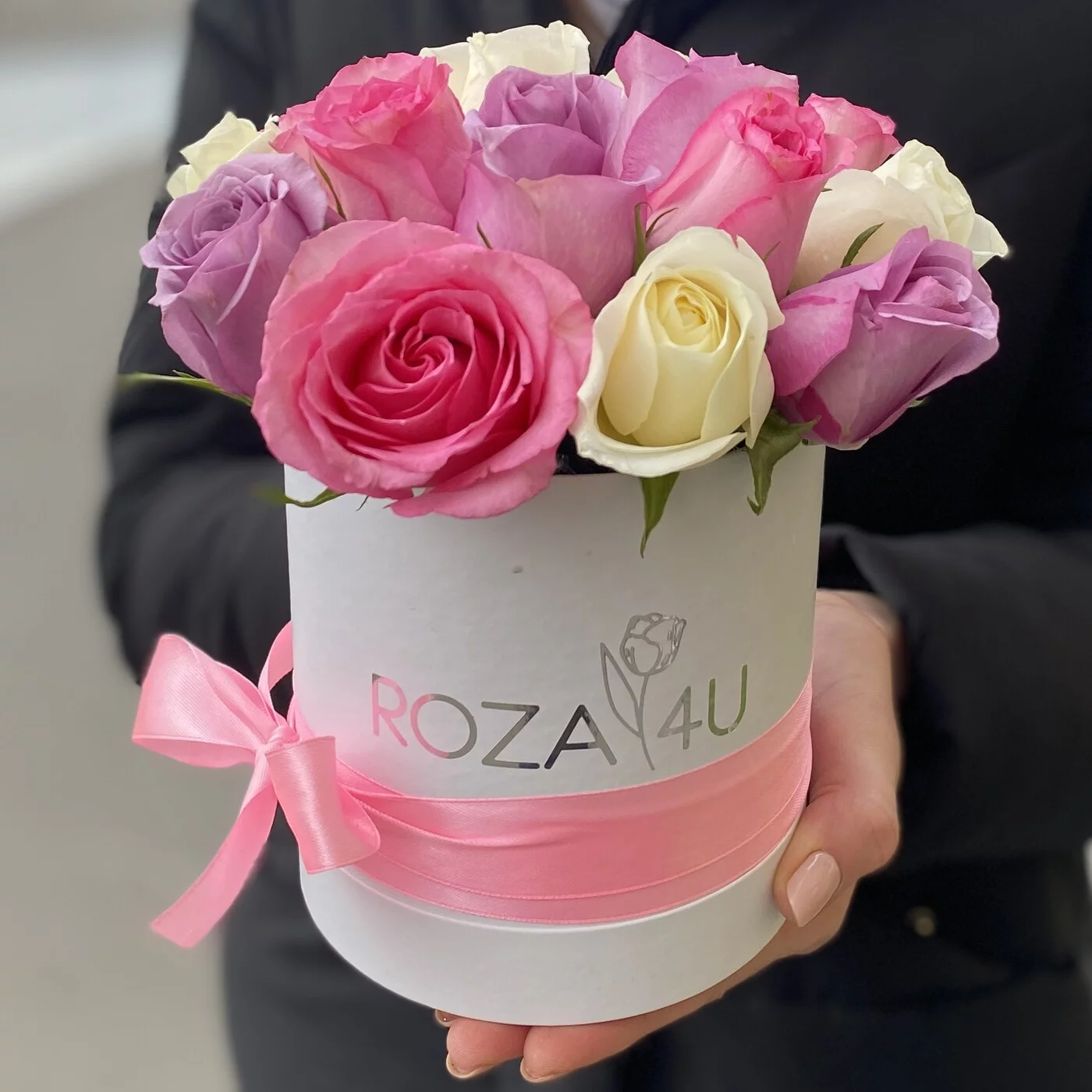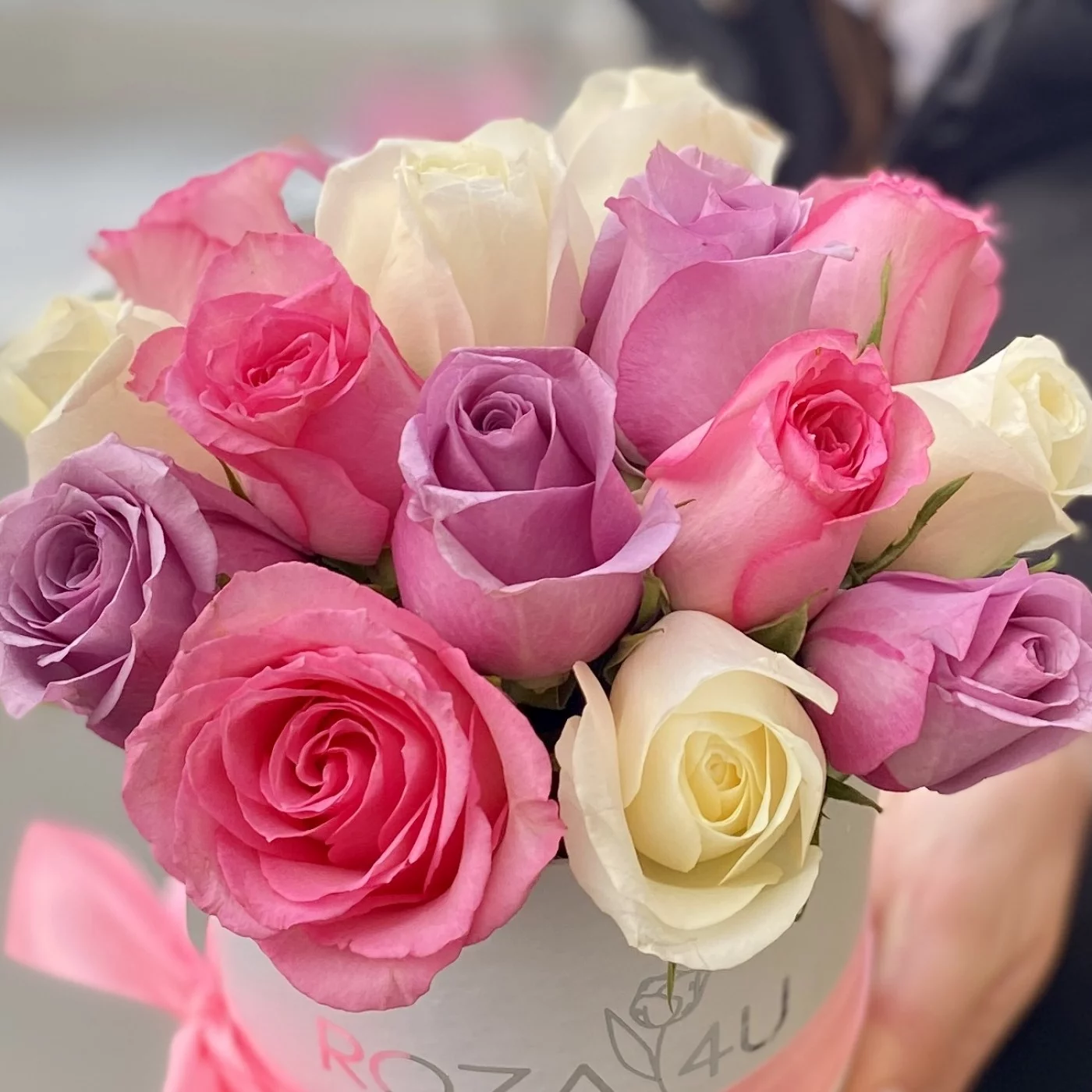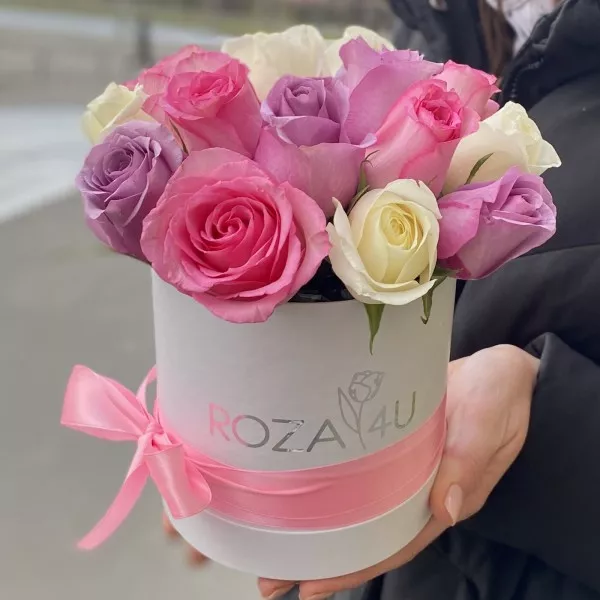 Состав букета: 15 сиреневых, розовых и белых роз, шляпная коробка для цветов.