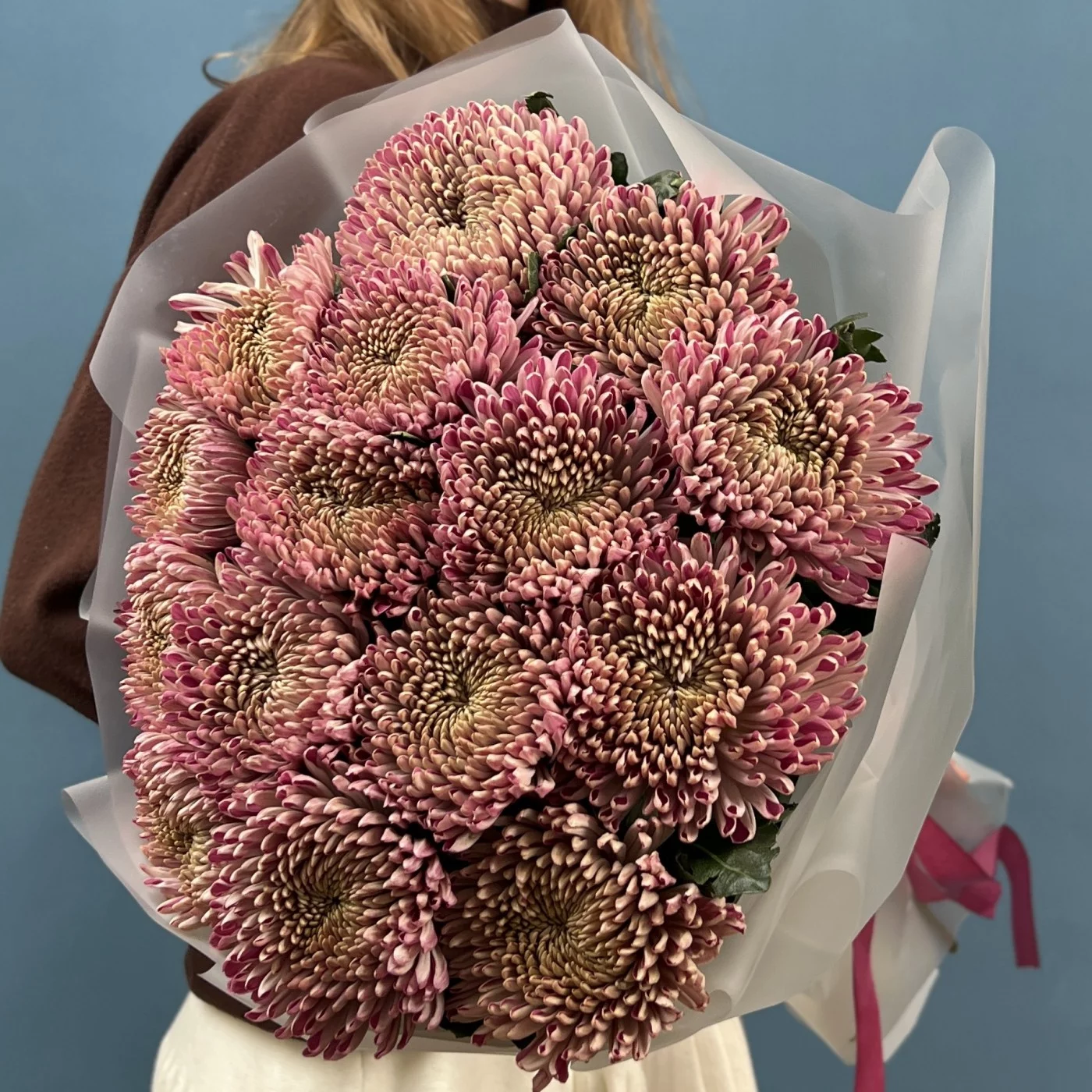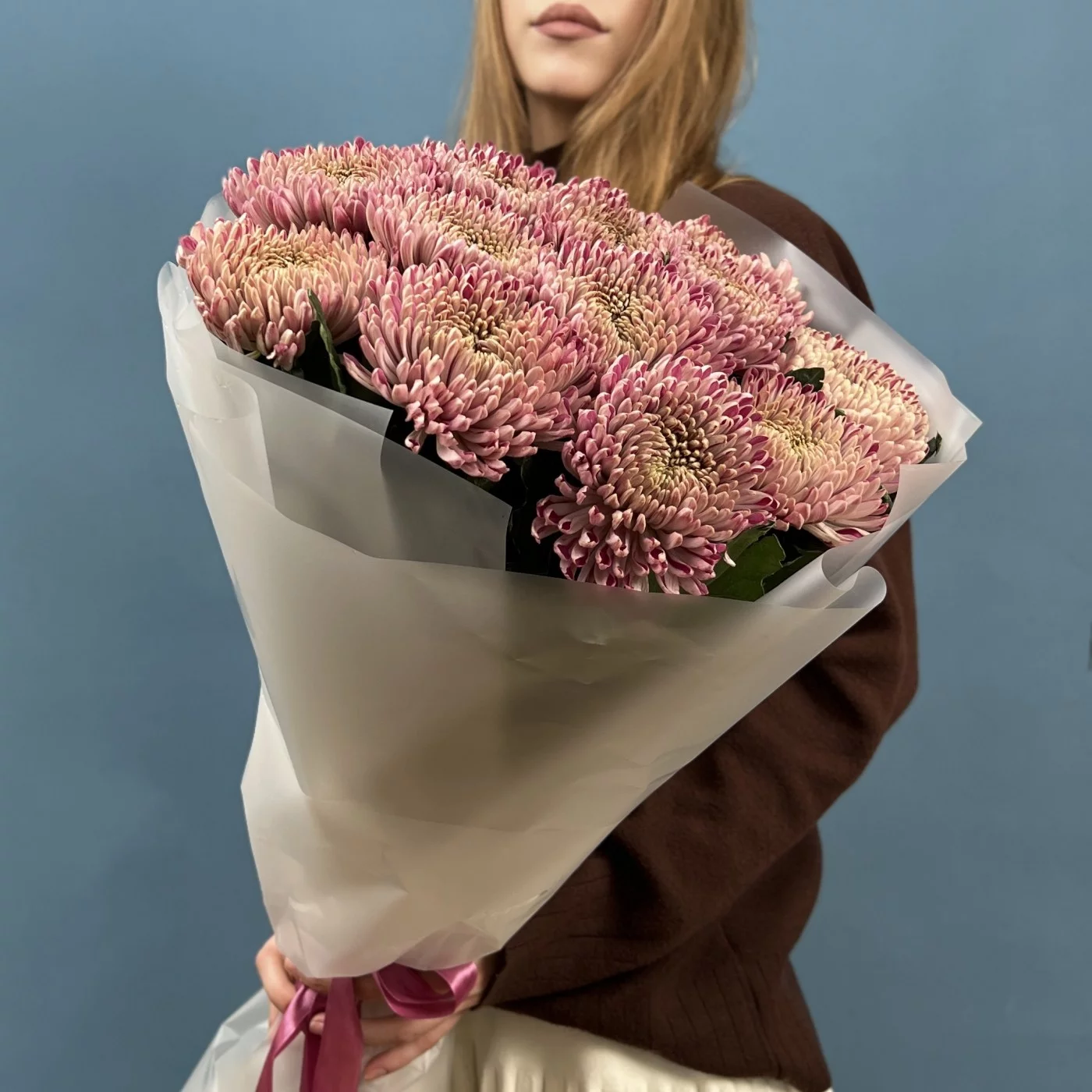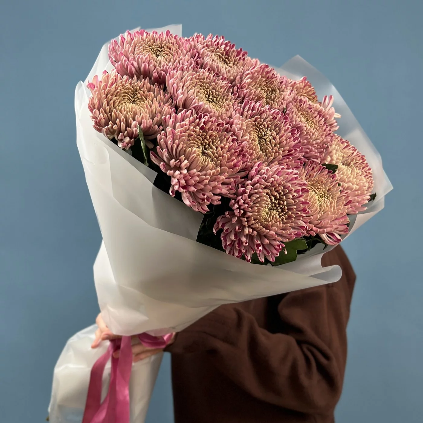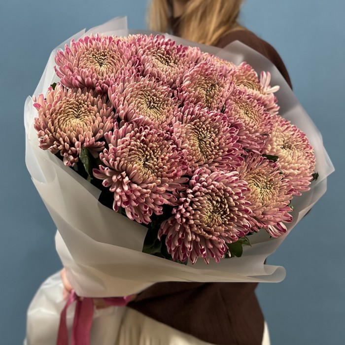 Букет из 15 сиреневых хризантем сорта Кутюр — это стильное и элегантное решение для любого повода.