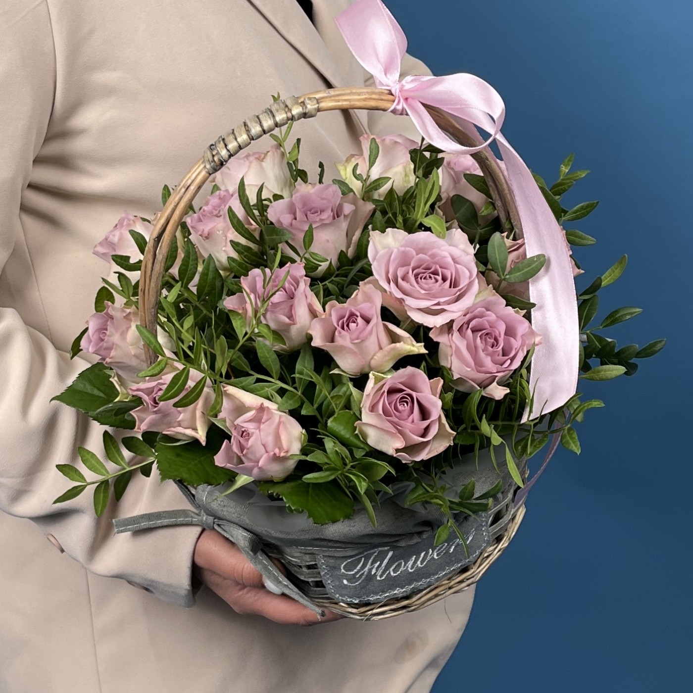 Нежный и изысканный букет из 15 сиреневых роз, символизирующий память, уважение и искренние чувства. Уложенные в красивую корзину, эти роскошные розы создают атмосферу тепла и утончённости, делая этот подарок идеальным для выражения глубокой благодарности, памяти или особых чувств. Мягкие сиреневые оттенки придают композиции особую трогательность и спокойствие.