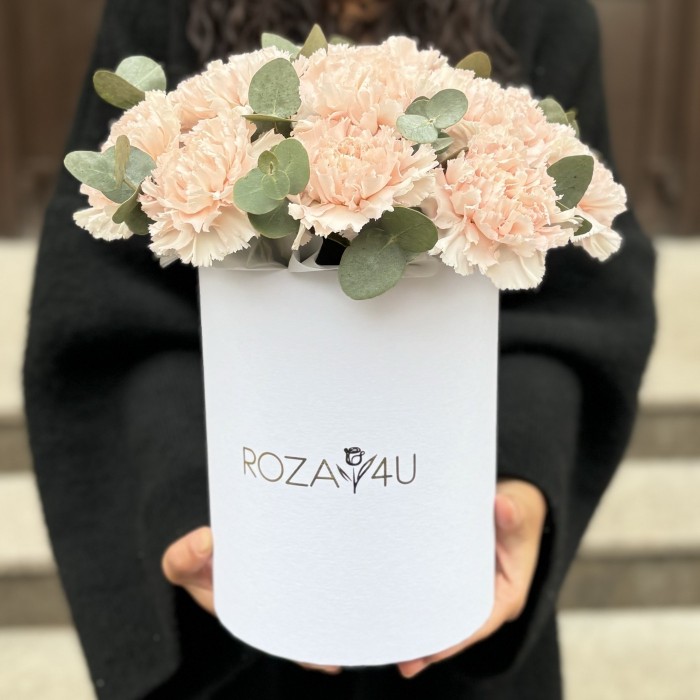 15 светло-розовых гвоздик с эвкалиптом в коробке.