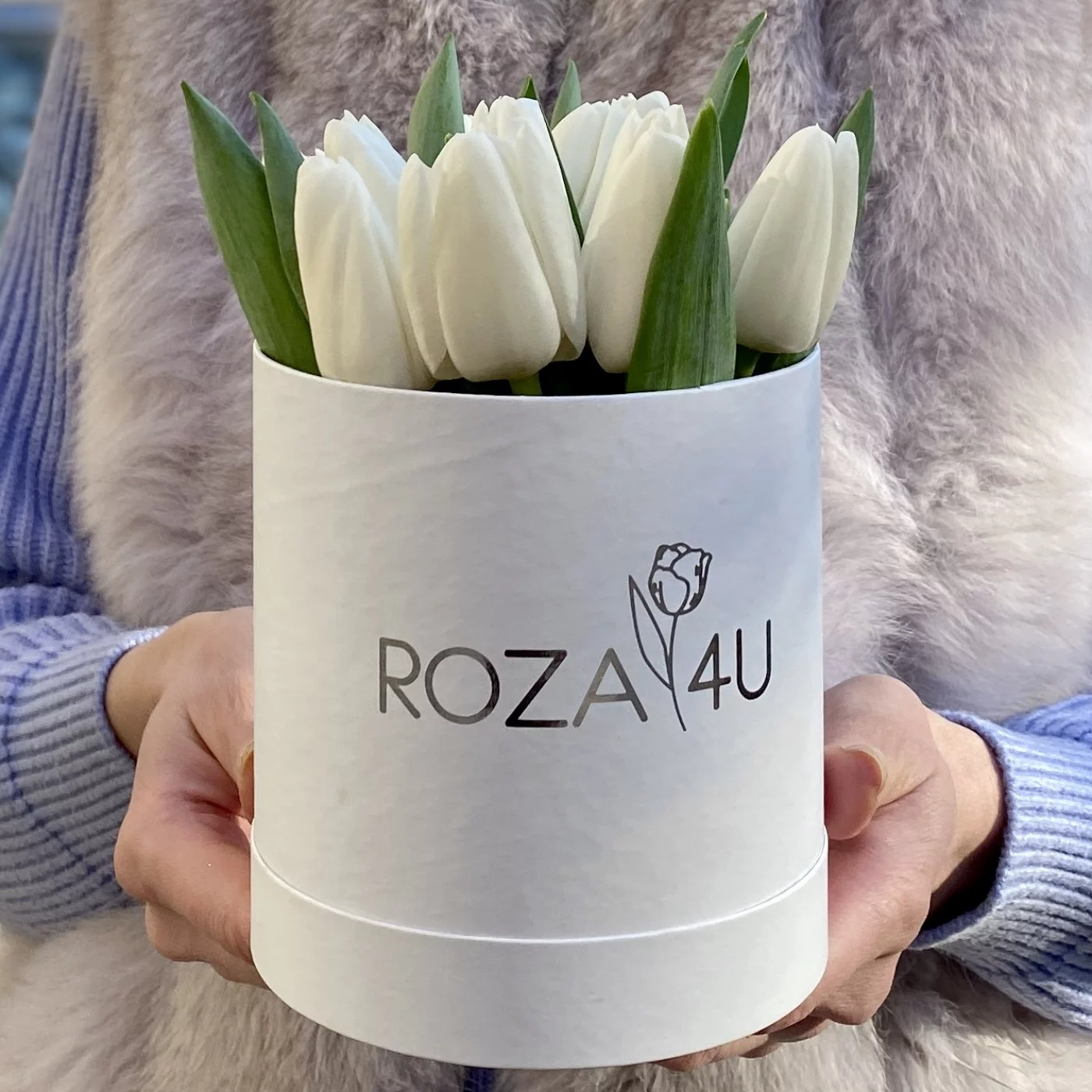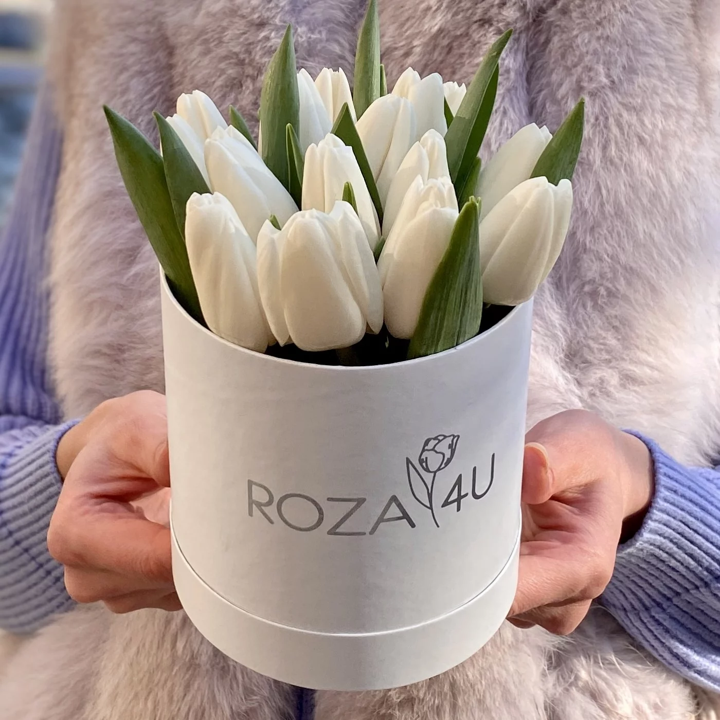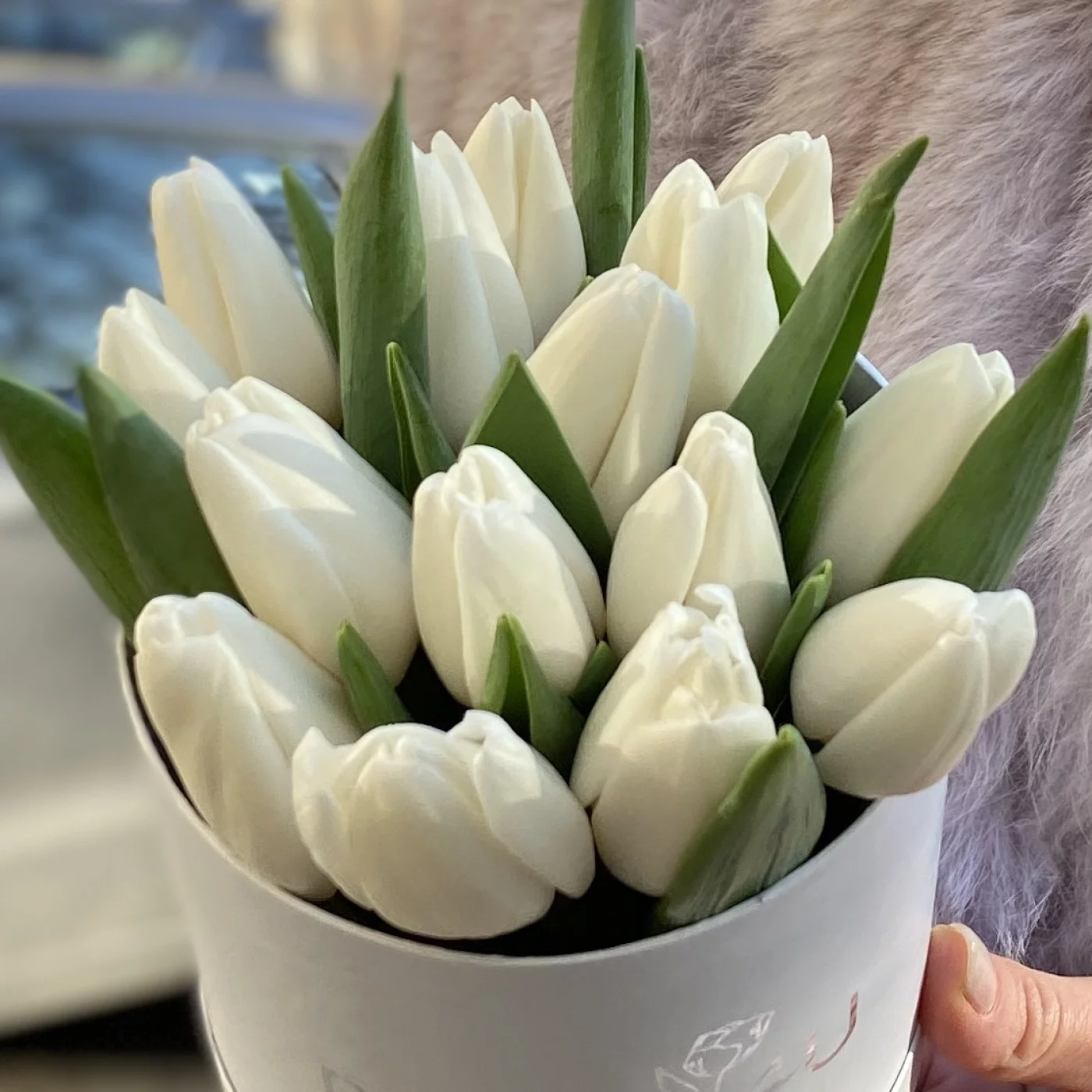 Коробка с 15 белых тюльпанами. Преподнесите такую композиция в качестве презента своим любимым людям. Прекрасный подарок к 8 марта.
