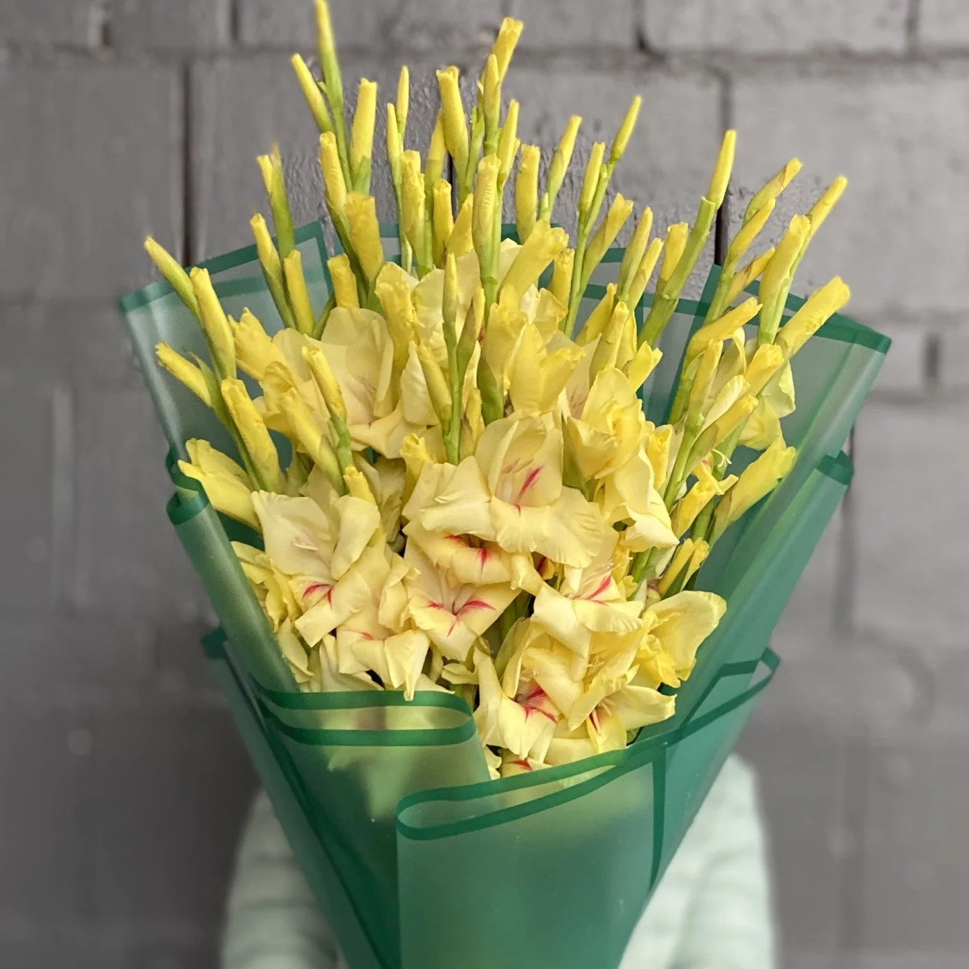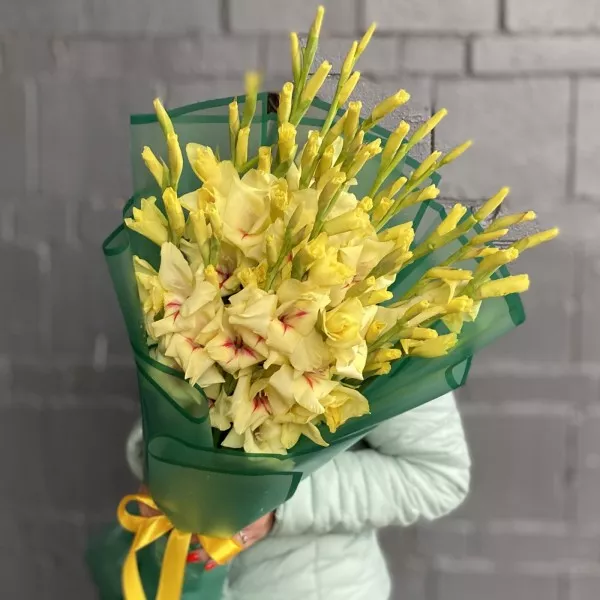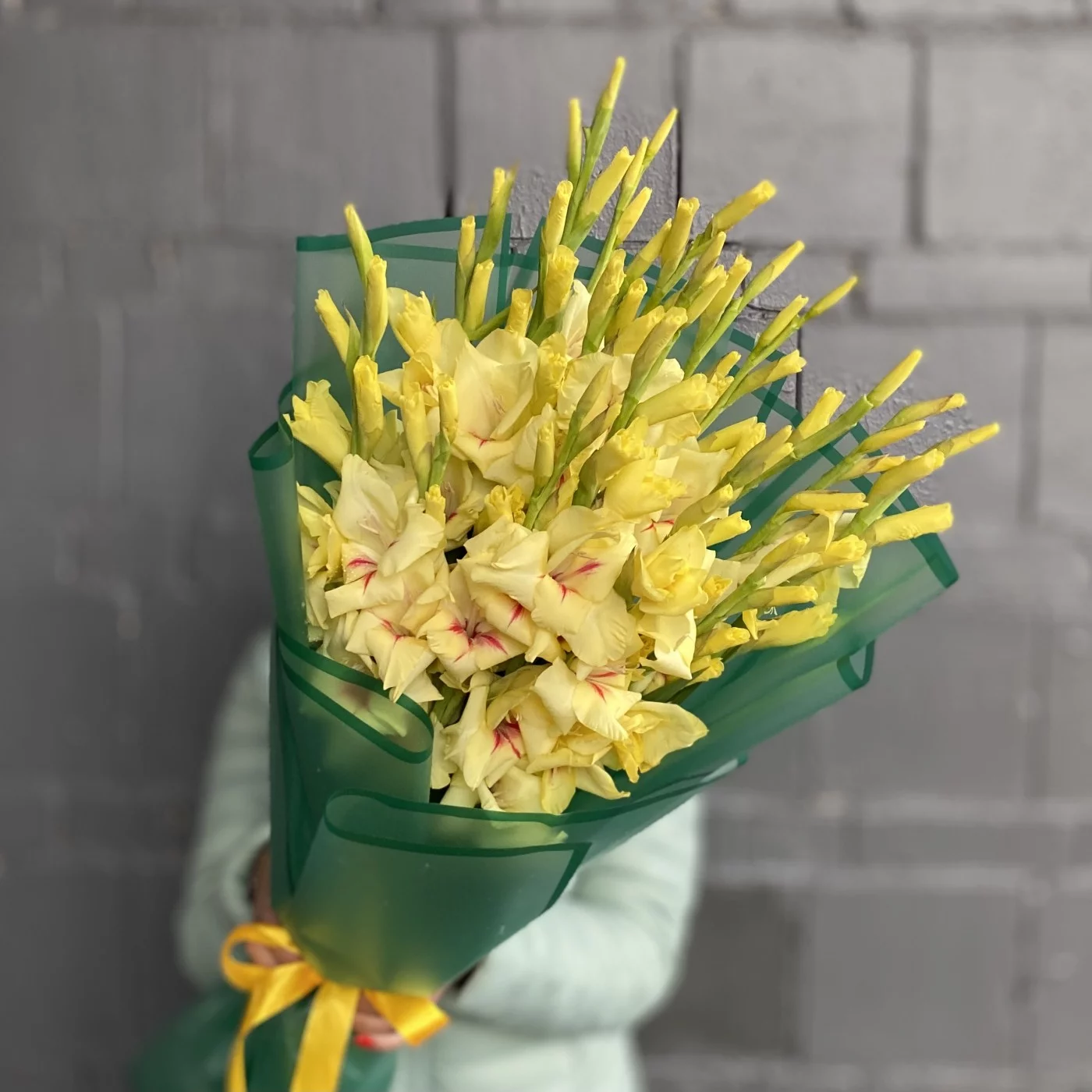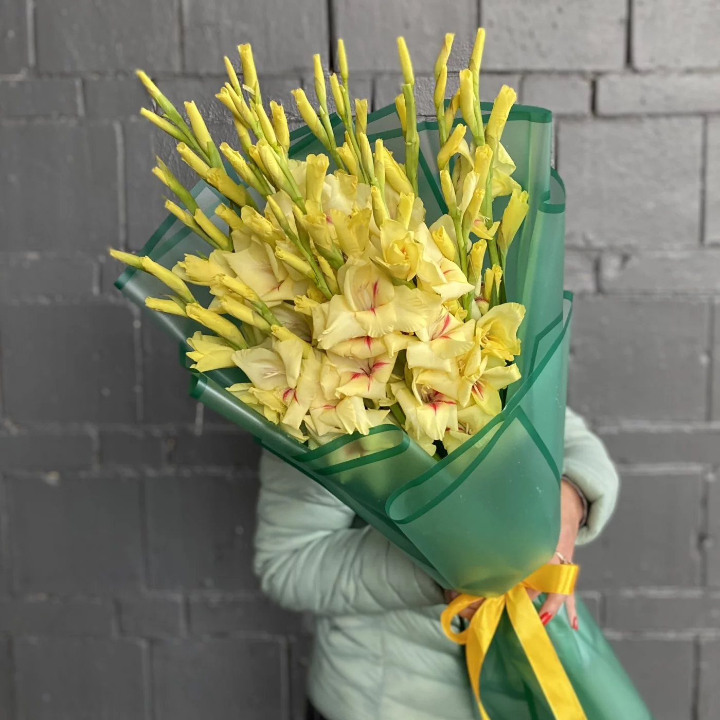 Букет из 15 ярких желтых гладиолусов. Гладиолусы – самые роскошные осенние цветы, которые не оставят равнодушным никого и смогут порадовать Вашего получателя. Гладиолусы уместно преподнести в качестве подарка уважаемому коллеге, партнеру по бизнесу.