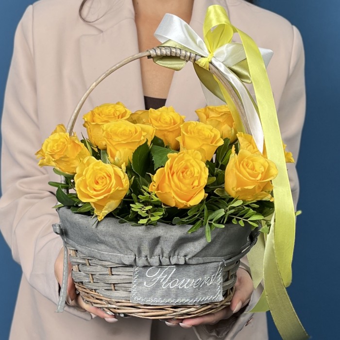 Яркая и жизнерадостная композиция из 15 свежих желтых роз, красиво оформленных в стильную корзину. Этот букет наполнит пространство солнечным светом и теплом, станет прекрасным подарком для выражения дружбы, радости и оптимизма.