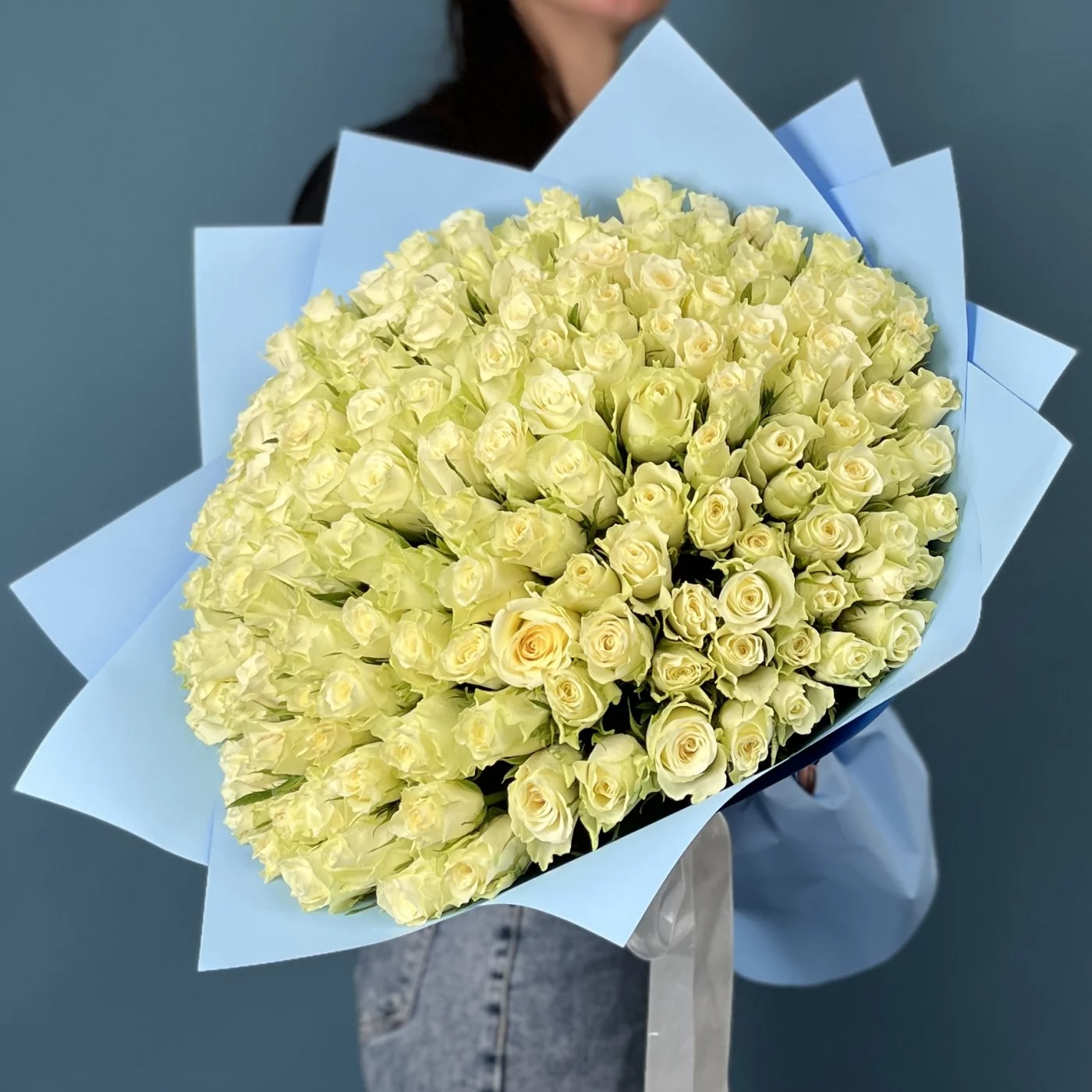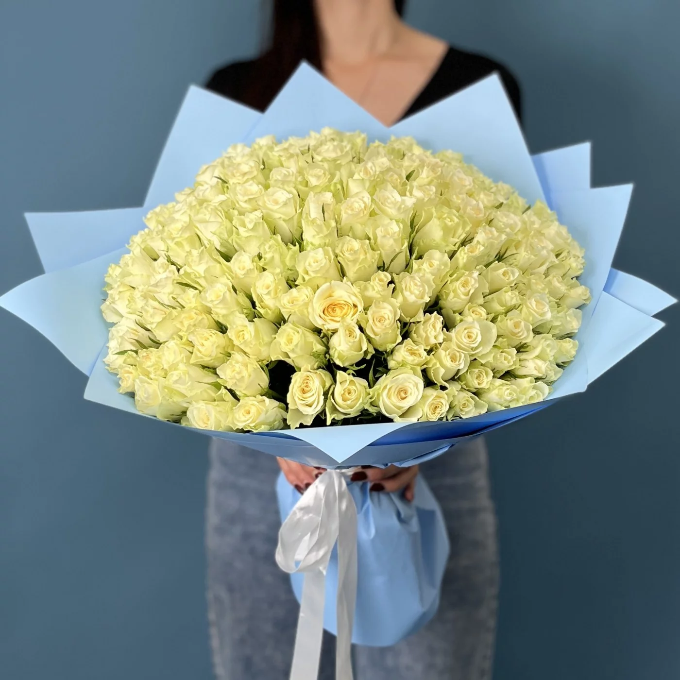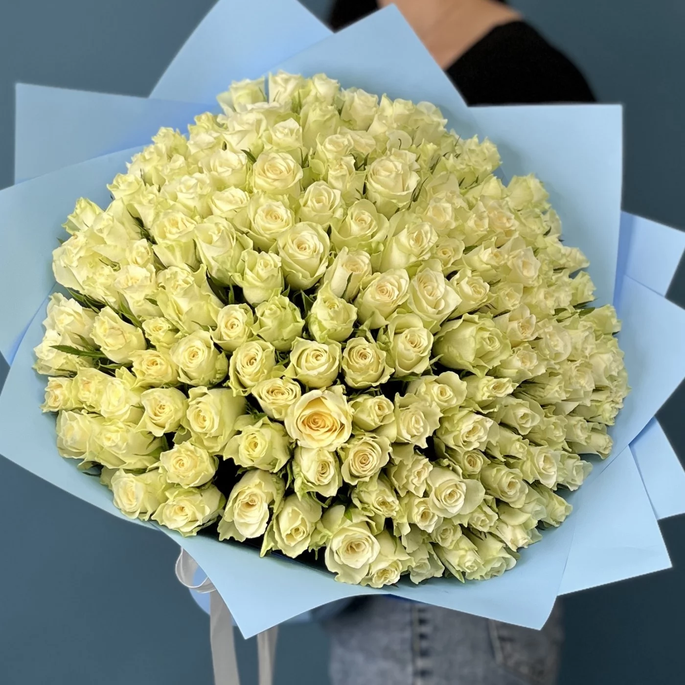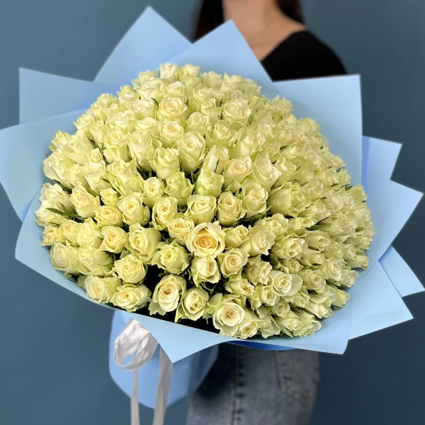 Такой обильный сбор свежих белых роз создаст эффектное и изысканное оформление для особого события, романтического сюрприза или торжественного мероприятия.