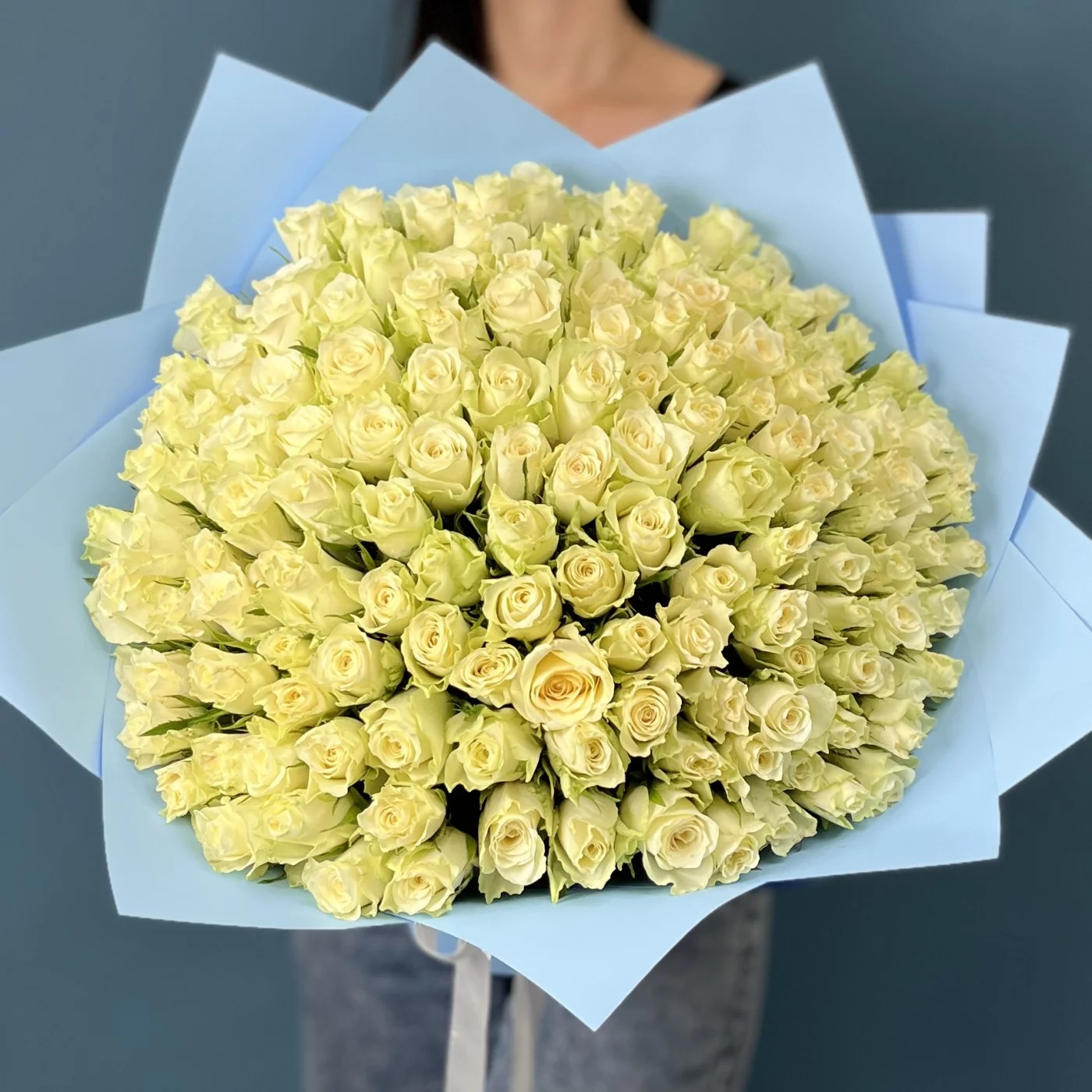 151 белая роза Атена высотой 40 см — это великолепный и элегантный букет, символизирующий чистоту, невинность и искренние чувства.