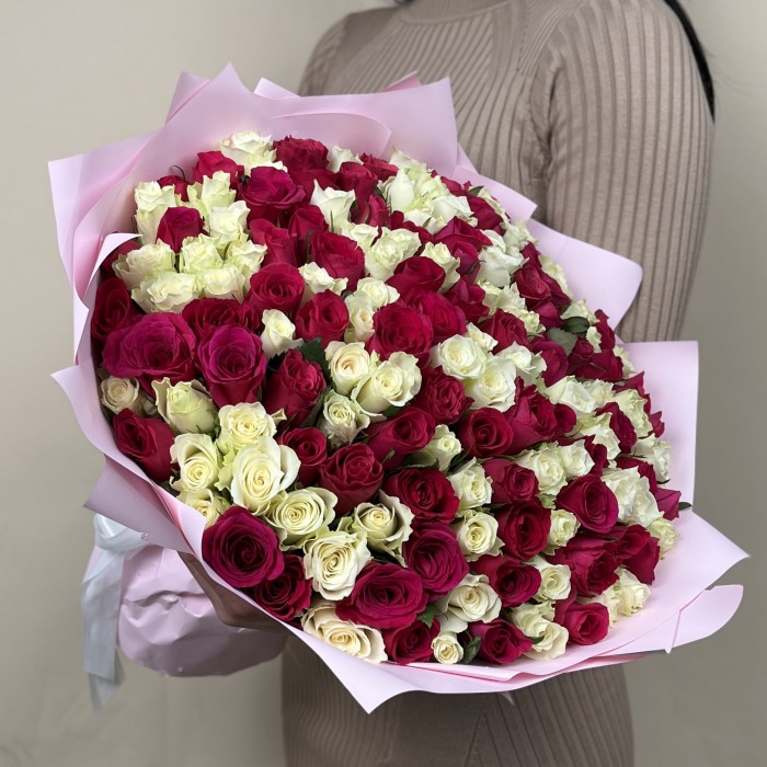 Букет из 151 бело-малиновой розы высотой 40 см — это действительно потрясающее и роскошное решение для любого торжества или особого события! Такой объемный и яркий букет не только произведёт впечатление, но и станет центром внимания на любом мероприятии.