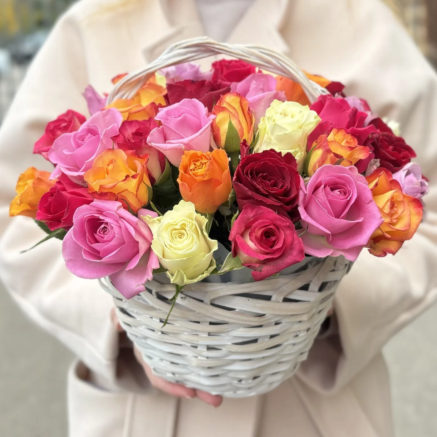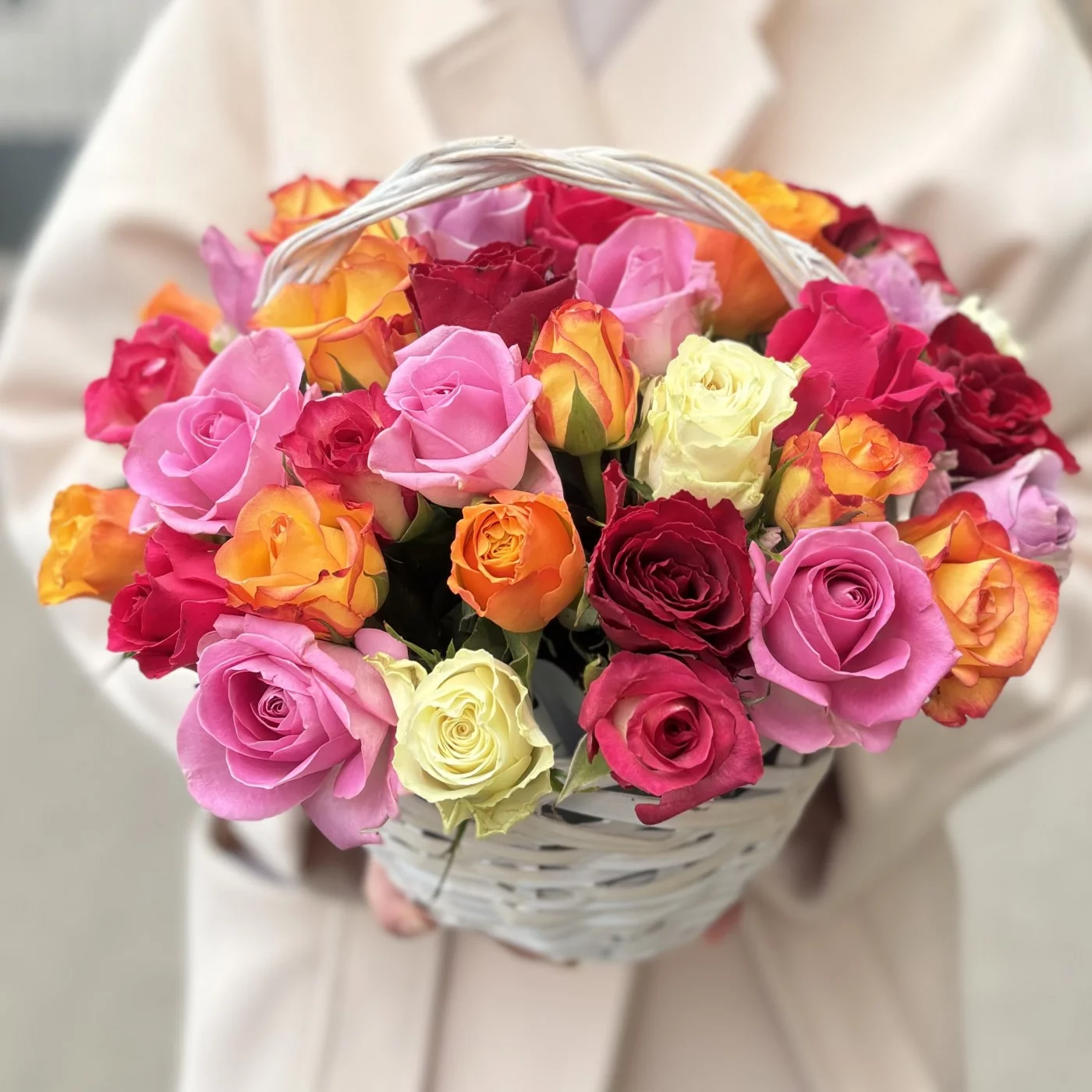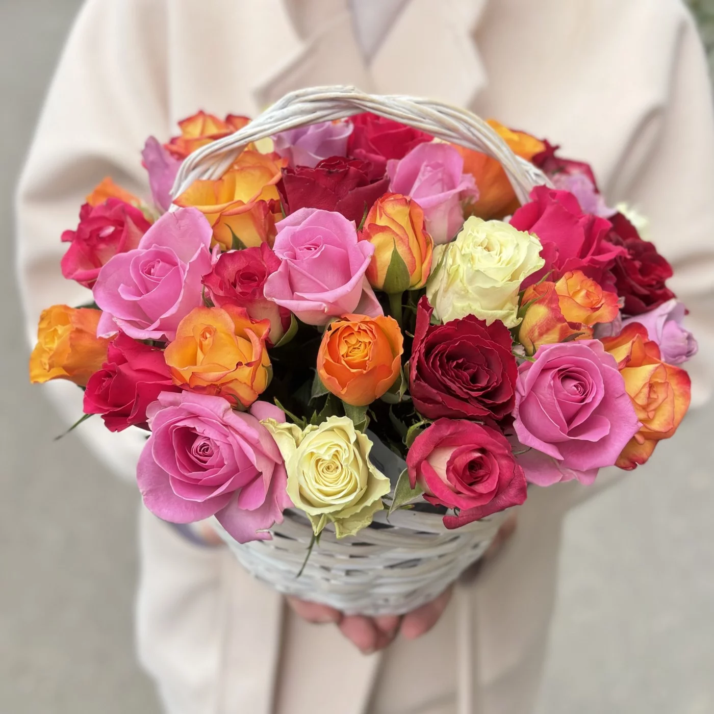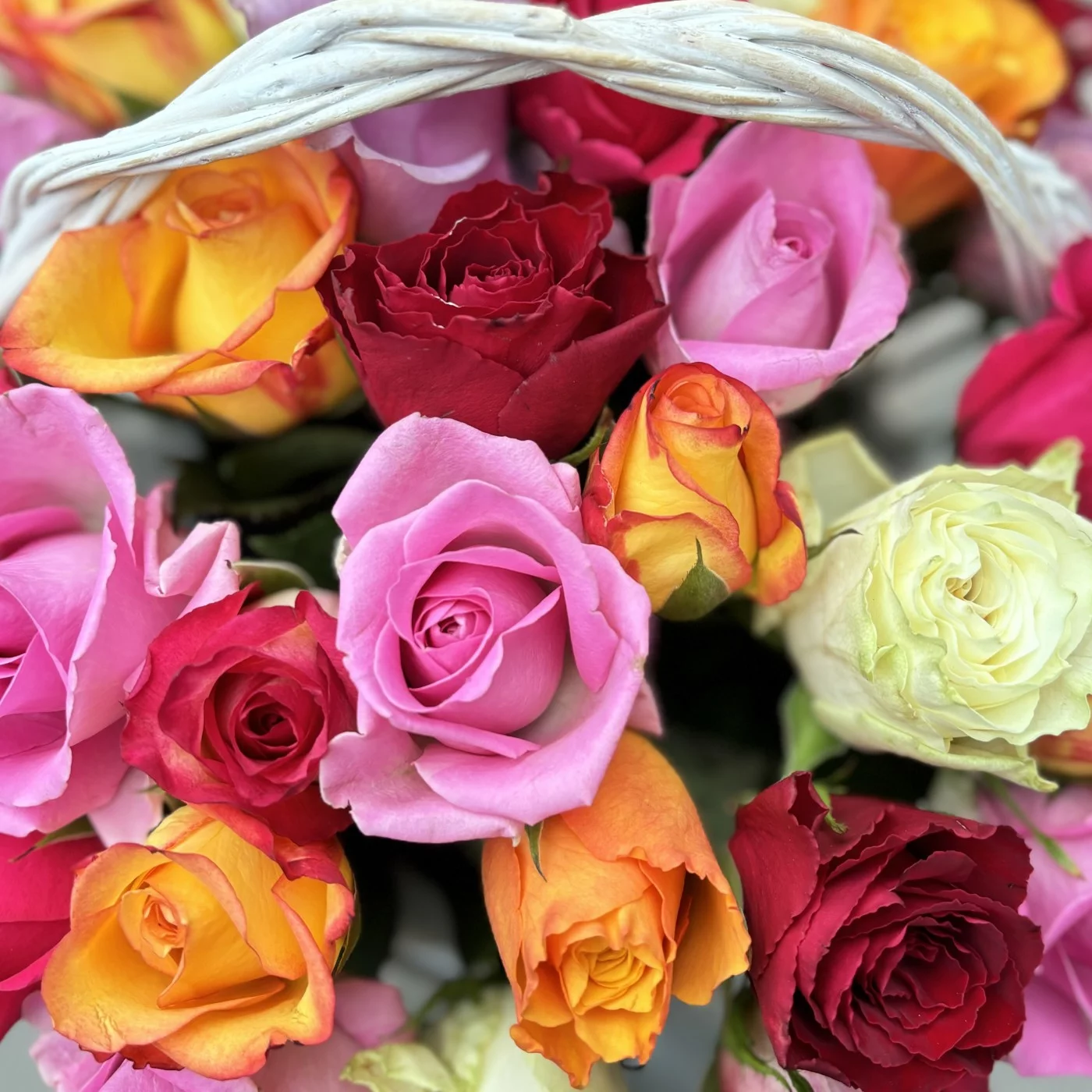 Микс из роз в корзине, в состав входят розы разных сортов.