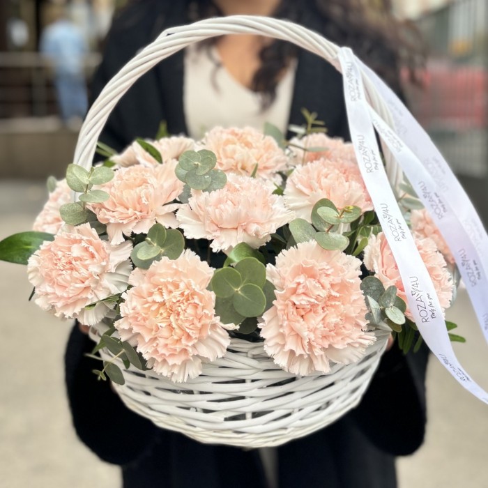 Нежная корзинка из 19 светло - розовых гвоздик в сочетании с ароматным эвкалиптом порадует своим необычным видом даже самую избирательную девушку.