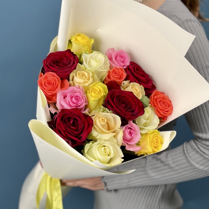 Яркий и насыщенный букет из 19 роз MIX высотой 60 см — это настоящее воплощение энергии и радости.