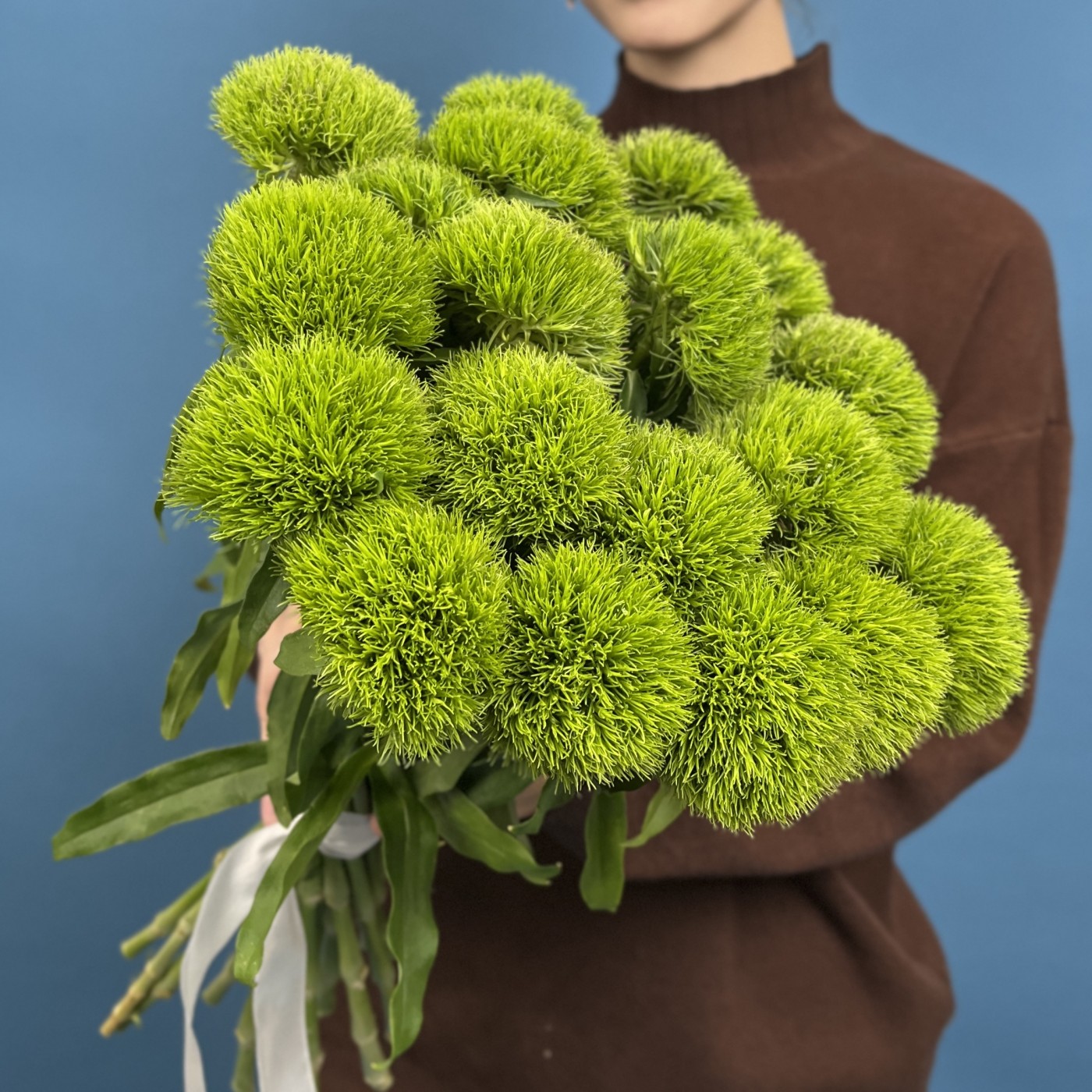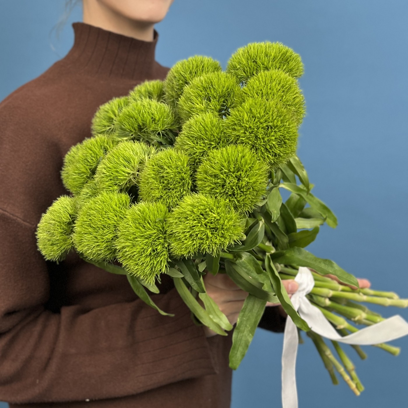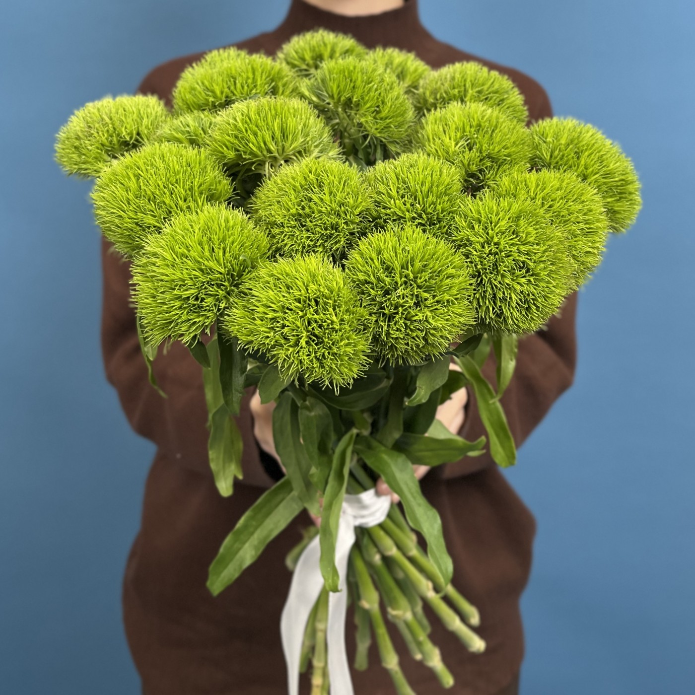 Букет из 19 зеленых пушистых гвоздик сорта «Грин Тик» — это яркая и необычная композиция, которая привнесет свежесть и оригинальность в любой интерьер.
