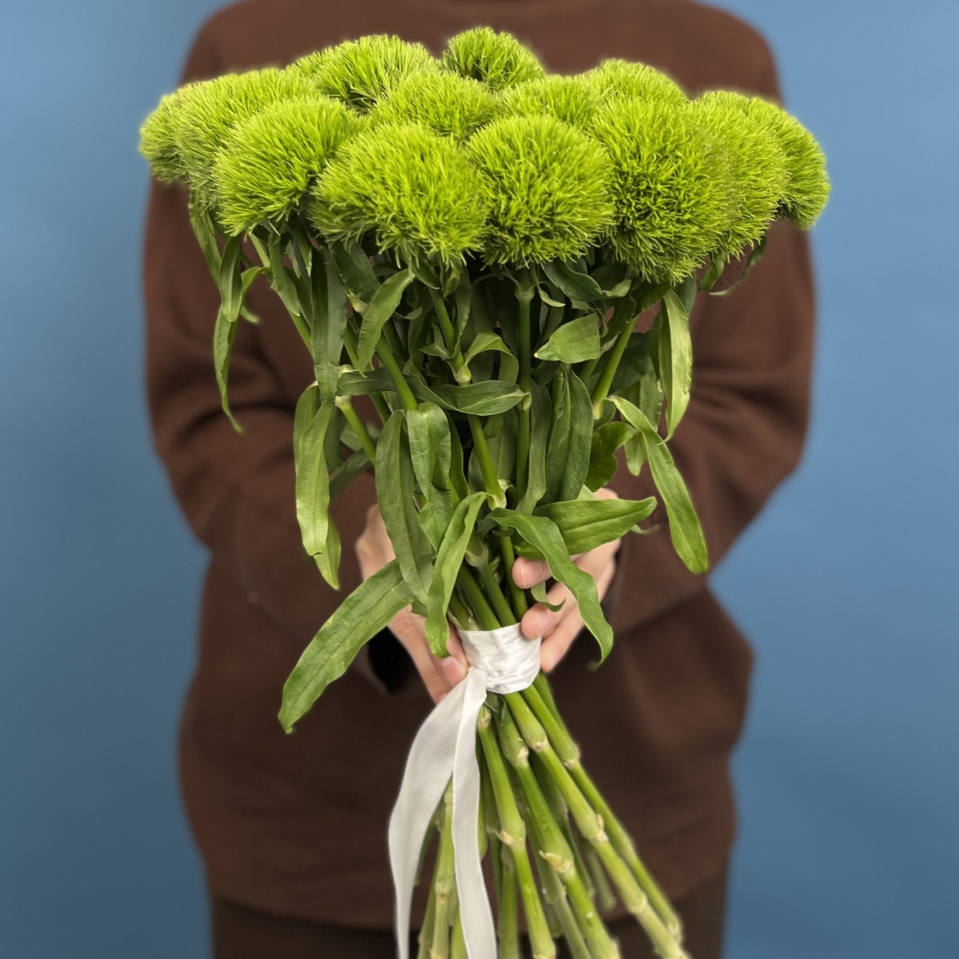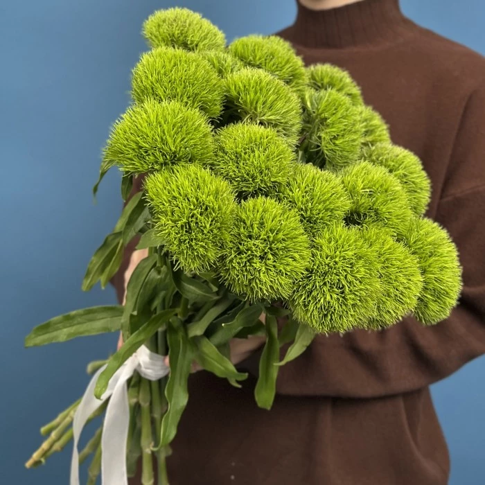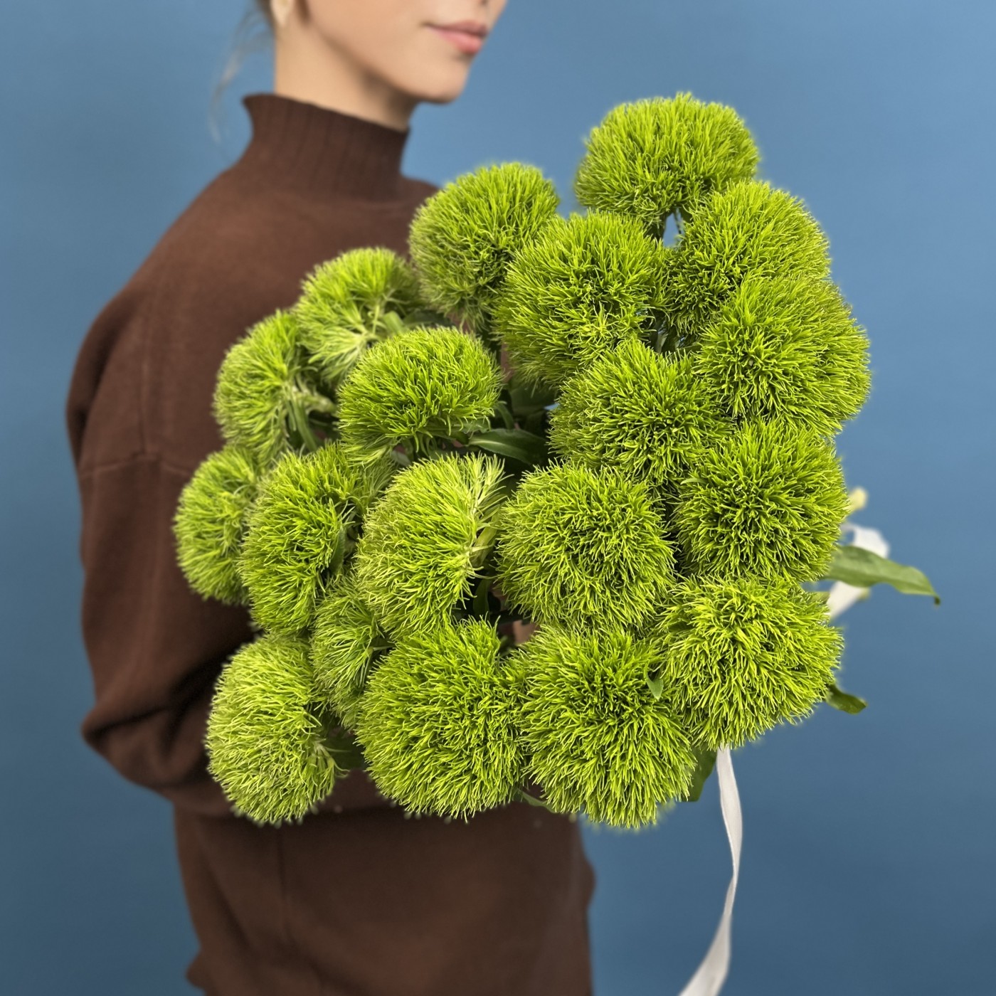 Букет из 19 зеленых пушистых гвоздик сорта «Грин Тик» — это яркая и необычная композиция, которая привнесет свежесть и оригинальность в любой интерьер.