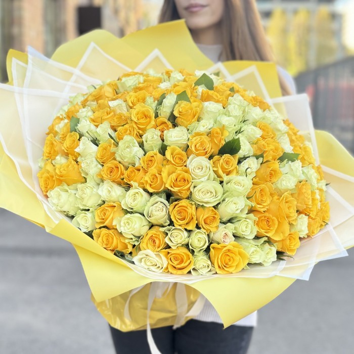 Букет из 201 желтой и белой розы высотой 40 см — это роскошная и впечатляющая композиция, которая станет великолепным подарком для любого торжества или важного события.