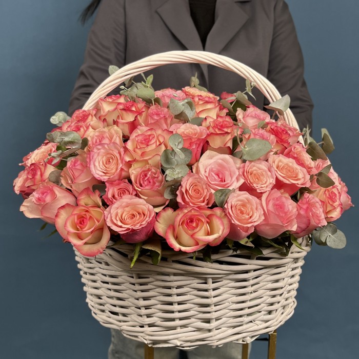 101 роза Алани микс с эвкалиптом в корзине — это великолепная и яркая композиция, которая станет идеальным подарком для любого праздника.