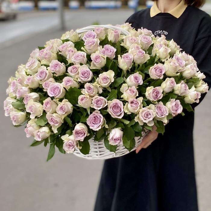 Роскошная корзина с розами необыкновенного сиреневого оттенка