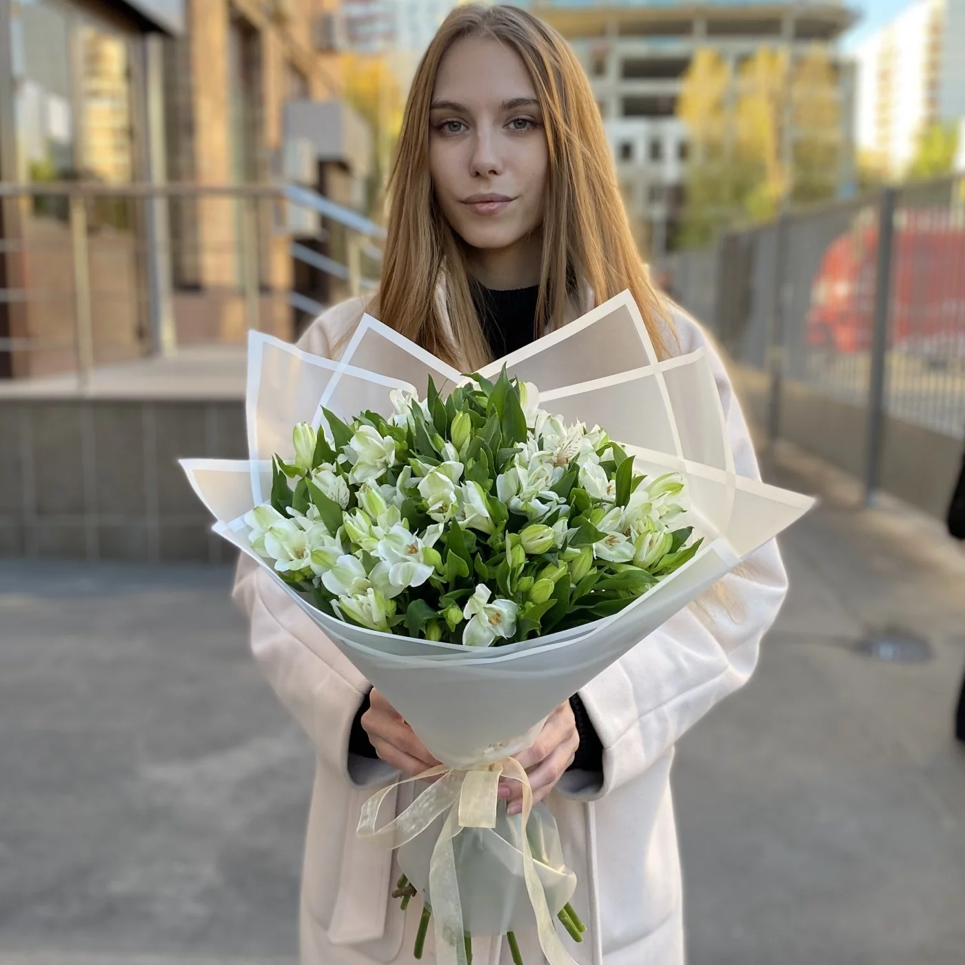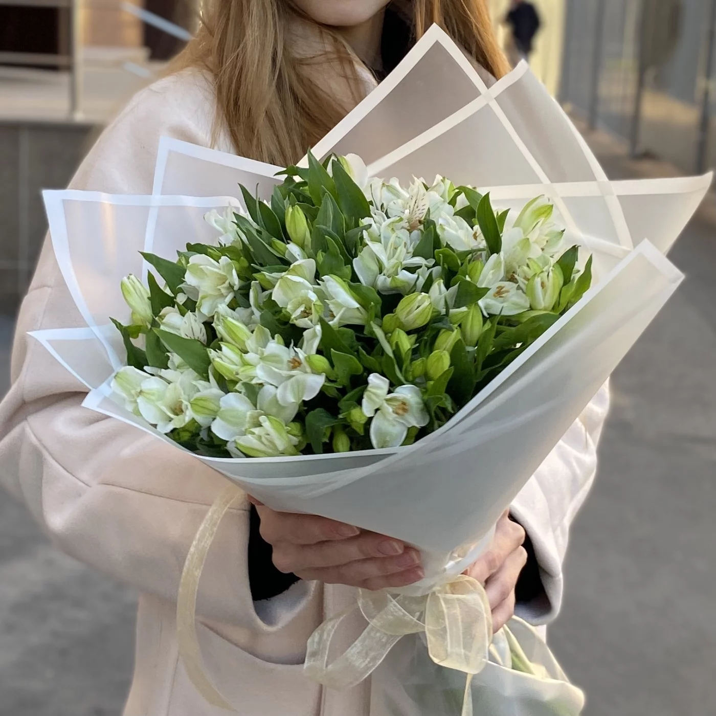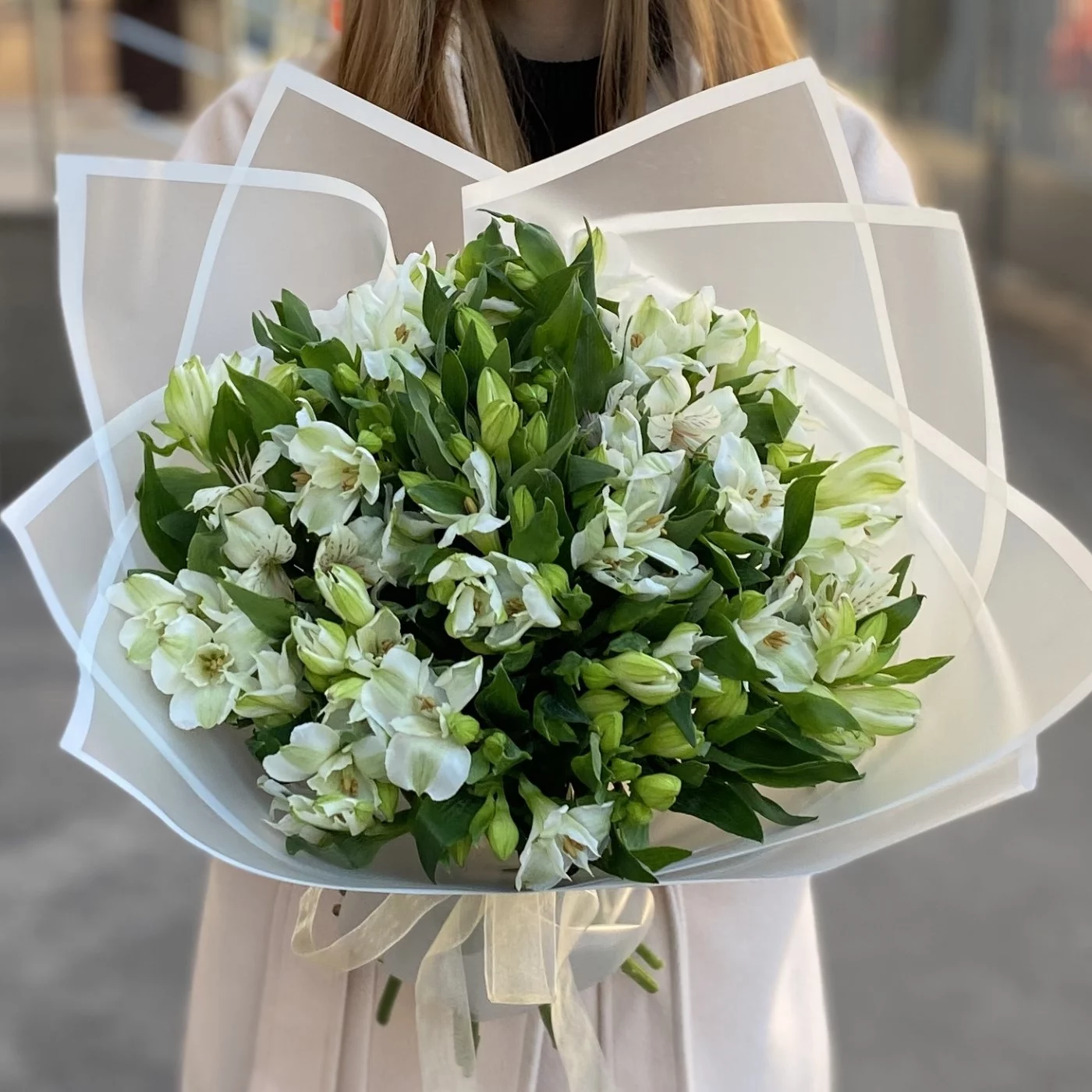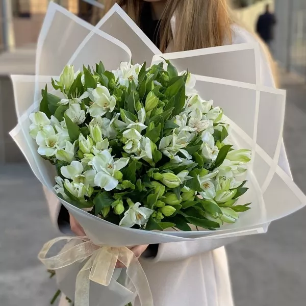 Букет из 21 белой альстромерии в стильной упаковке. Такой букет можно подарить маме в знак внимания или взять его с собой на свидание.