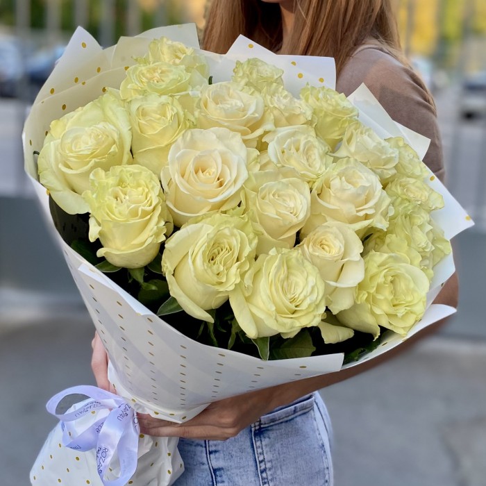 Букет из 21 белой розы сорта Мондиаль — это символ любви, уважения и нежности, который отлично подходит для самых разных торжеств и значимых событий.
