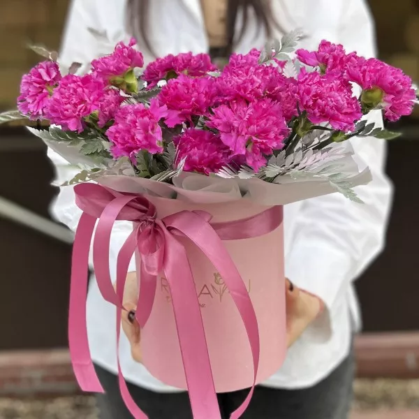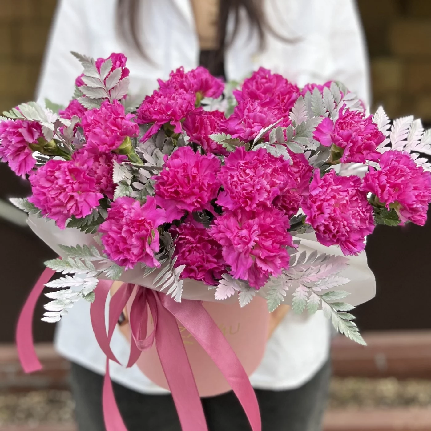 Коробка с 21 фиолетовой гвоздикой — это стильный и выразительный подарок, который сочетает в себе элегантность и глубину цвета.